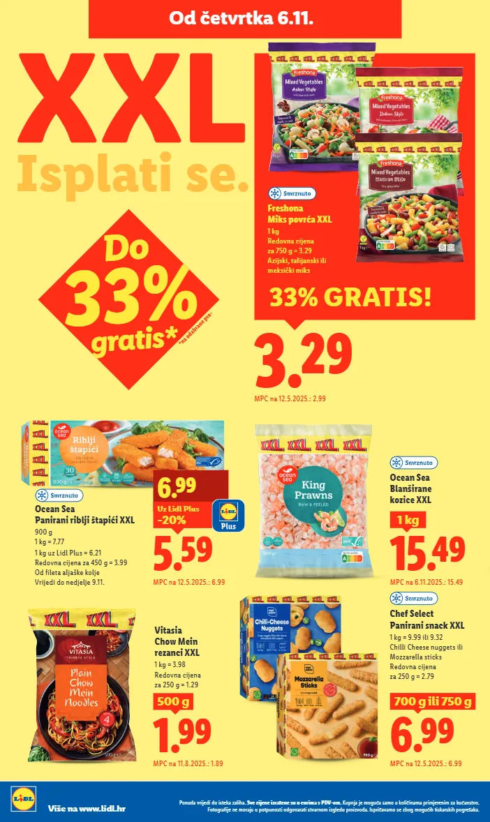 do 33% gratis* *na odabrane pro- ocean sea panirani riblji štapići xxl 900 g 1 kg = 7.77 1 kg uz lidl plus = 6.21 redovna cijena za 450 g = 3.99 od fileta aljaške kolje vrijedi do nedjelje 9.11. 5.59 6.99 mpc na 12.5.2025.: 6.99 -20% uz lidl plus vitasia chow mein rezanci xxl 1 kg = 3.98 redovna cijena za 250 g = 1.29 1.99 500 g mpc na 11.8.2025.: 1.89 6.99 700 g ili 750 g mpc na 12.5.2025.: 6.99 15.49 1 kg mpc na 6.11.2025.: 15.49 chef select panirani snack xxl 1 kg = 9.99 ili 9.32 chilli cheese nuggets ili mozzarella sticks redovna cijena za 250 g = 2.79 ocean sea blanširane kozice xxl 3.29 freshona miks povrća xxl 1 kg redovna cijena za 750 g = 3.29 azijski, talijanski ili meksički miks mpc na 12.5.2025.: 2.99 33% gratis! xxl isplati se. ponuda vrijedi do isteka zaliha. sve cijene izražene su u eurima s pdv-om. kupnja je moguća samo u količinama primjerenim za kućanstvo. fotografije ne moraju u potpunosti odgovarati stvarnom izgledu proizvoda. ispričavamo se zbog mogućih tiskarskih pogrešaka. više na www.lidl.hr od četvrtka 6.11.