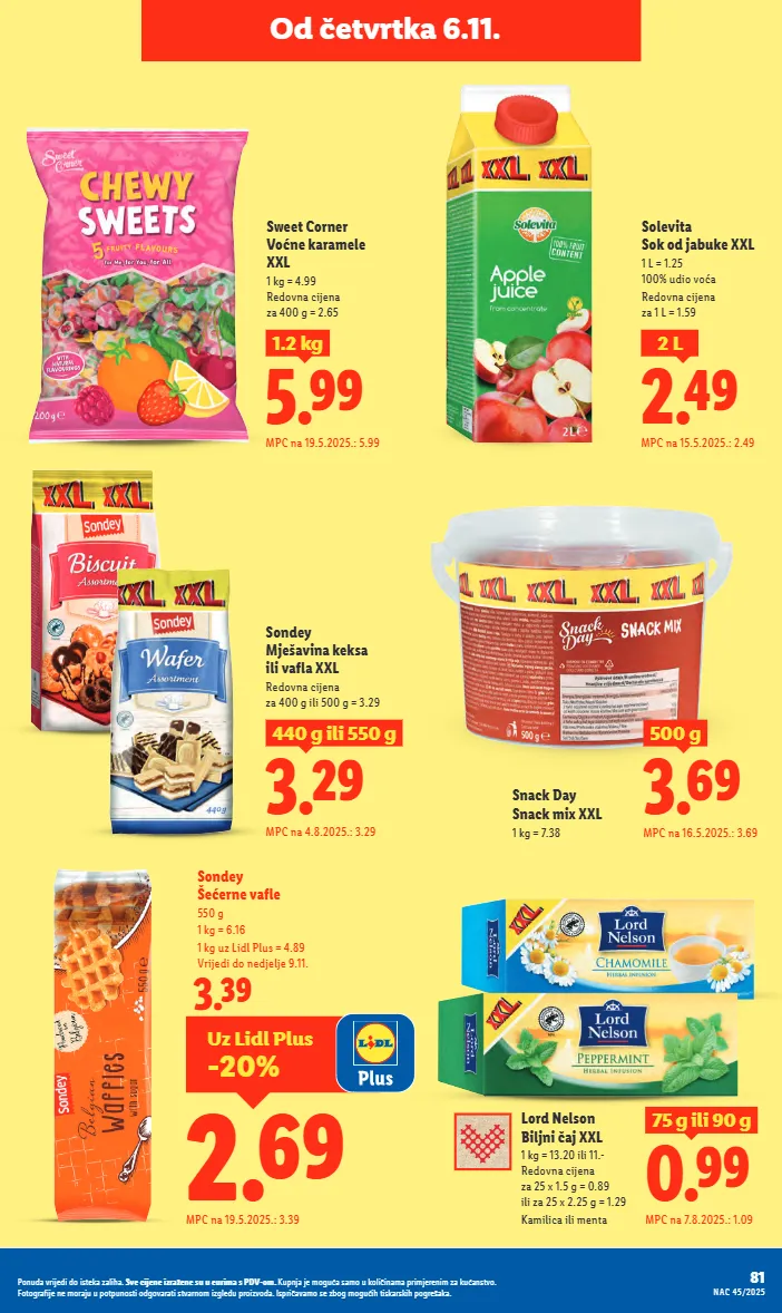 Solevita Sok od jabuke XXL 1 L = 1.25 100% udio voća Redovna cijena za 1 L = 1.59 2.49 2 L MPC na 15.5.2025.: 2.49 0.99 75 g ili 90 g MPC na 7.8.2025.: 1.09 Lord Nelson Biljni čaj XXL 1 kg = 13.20 ili 11.- Redovna cijena za 25 x 1.5 g = 0.89 ili za 25 x 2.25 g = 1.29 Kamilica ili menta Snack Day Snack mix XXL 1 kg = 7.38 3.69 500 g MPC na 16.5.2025.: 3.69 Sweet Corner Voćne karamele XXL 1 kg = 4.99 Redovna cijena za 400 g = 2.65 Sondey Mješavina keksa ili vafla XXL Redovna cijena za 400 g ili 500 g = 3.29 3.29 440 g ili 550 g MPC na 4.8.2025.: 3.29 5.99 1.2 kg MPC na 19.5.2025.: 5.99 Sondey Šećerne vafle 550 g 1 kg = 6.16 1 kg uz Lidl Plus = 4.89 Vrijedi do nedjelje 9.11. Uz Lidl Plus -20% 2.69 MPC na 19.5.2025.: 3.39 3.39 81 Ponuda vrijedi do isteka zaliha. Sve cijene izražene su u eurima s PDV-om. Kupnja je moguća samo u količinama primjerenim za kućanstvo. Fotografije ne moraju u potpunosti odgovarati stvarnom izgledu proizvoda. Ispričavamo se zbog mogućih tiskarskih pogrešaka. Od četvrtka 6.11. NAC 45/2025