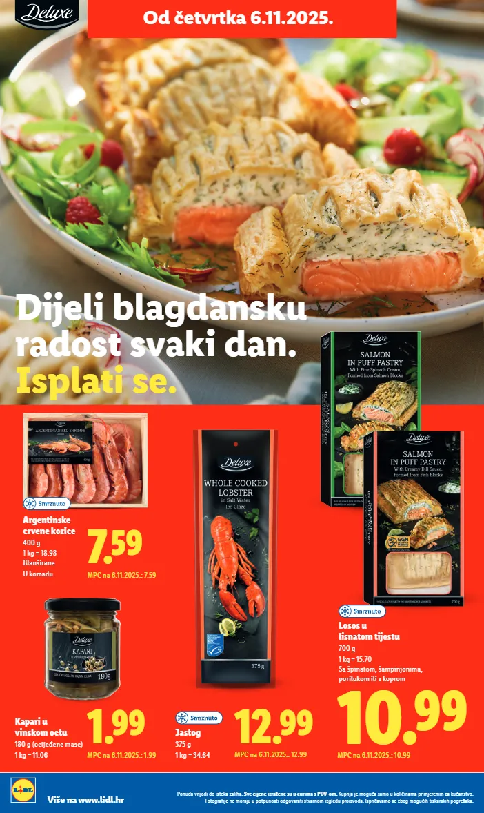 12.99 mpc na 6.11.2025.: 12.99 jastog 375 g 1 kg = 34.64 1.99 mpc na 6.11.2025.: 1.99 kapari u vinskom octu 180 g (ocijeđene mase) 1 kg = 11.06 7.59 mpc na 6.11.2025.: 7.59 argentinske crvene kozice 400 g 1 kg = 18.98 blanširane u komadu dijeli blagdansku radost svaki dan. isplati se. 10.99 mpc na 6.11.2025.: 10.99 losos u lisnatom tijestu 700 g 1 kg = 15.70 sa špinatom, šampinjonima, porilukom ili s koprom od četvrtka 6.11.2025. ponuda vrijedi do isteka zaliha. sve cijene izražene su u eurima s pdv-om. kupnja je moguća samo u količinama primjerenim za kućanstvo. fotografije ne moraju u potpunosti odgovarati stvarnom izgledu proizvoda. ispričavamo se zbog mogućih tiskarskih pogrešaka. više na www.lidl.hr
