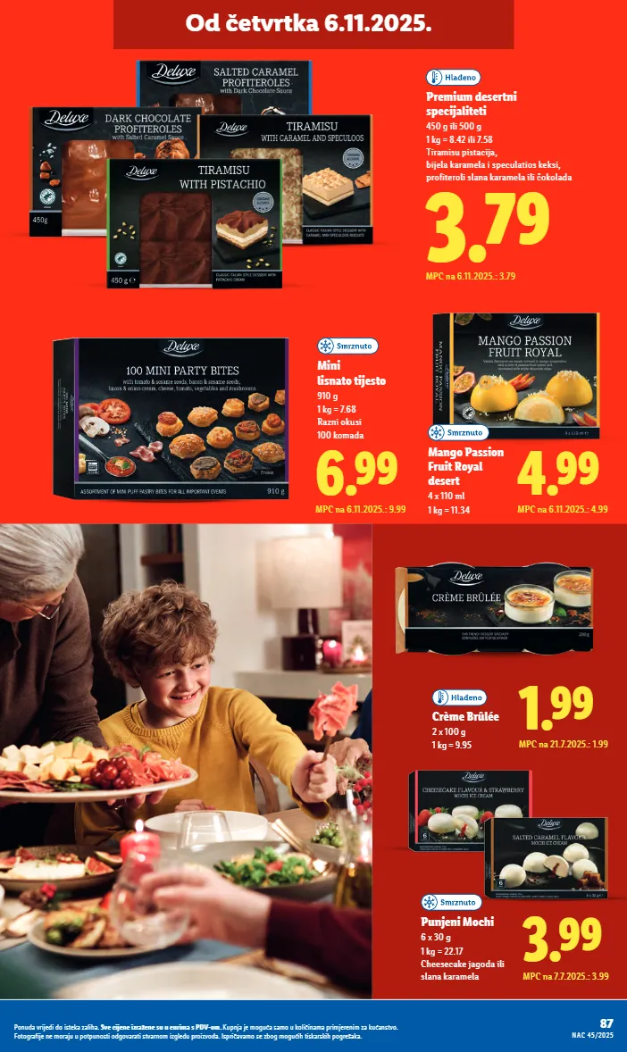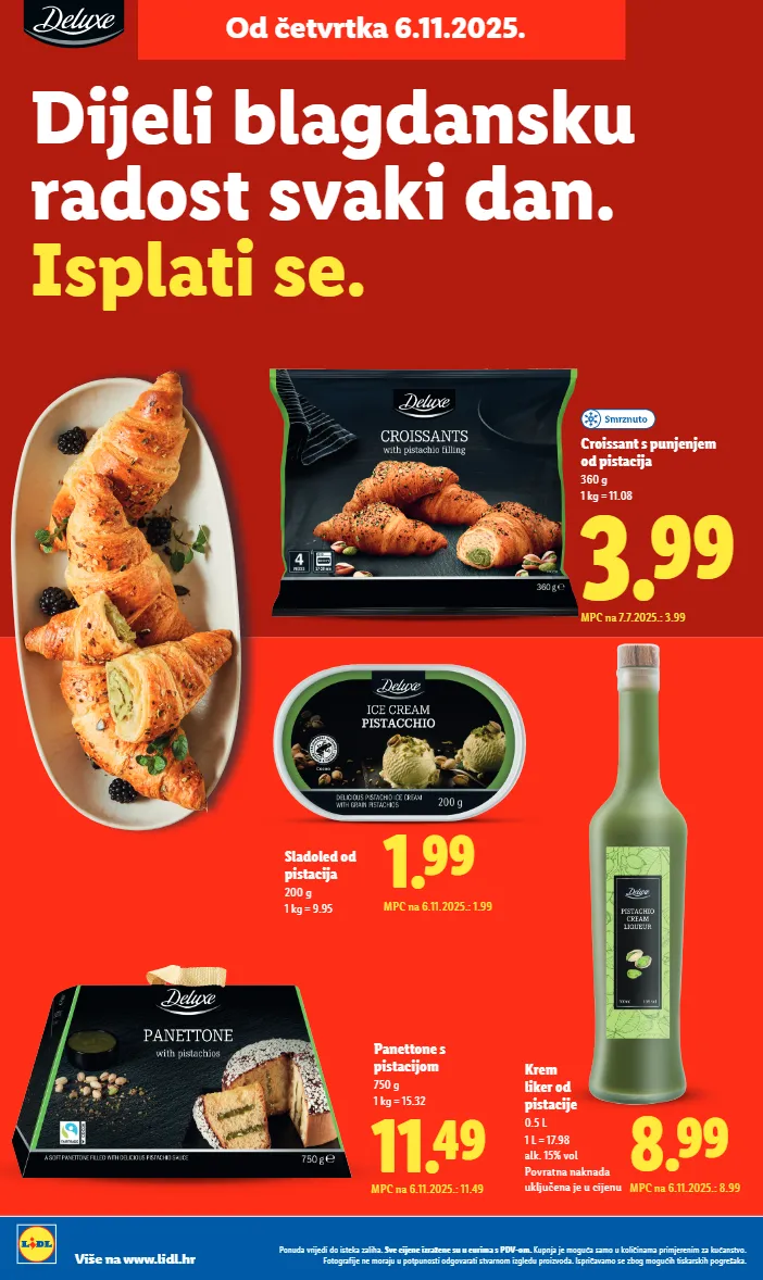 ponuda vrijedi do isteka zaliha. sve cijene izražene su u eurima s pdv-om. kupnja je moguća samo u količinama primjerenim za kućanstvo. fotografije ne moraju u potpunosti odgovarati stvarnom izgledu proizvoda. ispričavamo se zbog mogućih tiskarskih pogrešaka. više na www.lidl.hr 4.49 mpc na 4.9.2025.: 4.49 orašasti plodovi s mliječnom čokoladom 175 g 1 kg = 25.66 indijski oraščići ili pistacije 5.29 mpc na 18.7.2025.: 5.29 svježi lješnjak prutići 180 g 1 kg = 29.39 ručno izrađeni 45% pistacija novo u našem stalnom asortimanu dijeli blagdansku radost svaki dan. isplati se. 1.99 mpc na 2.5.2025.: 1.99 čaj u piramida vrećicama 20 x 1.6 g ili 20 x 2 g zeleni čaj i menta ili voćni čaj 7.99 mpc na 14.7.2025.: 7.99 bijela ili crna tartufata 90 g 1 kg = 88.78 s istarskim tartufima 3.99 mpc na 2.5.2025.: 3.99 premium namaz od pistacija 190 g 1 kg = 21.- ponuda vrijedi do isteka zaliha. sve cijene izražene su u eurima s pdv-om. kupnja je moguća samo u količinama primjerenim za kućanstvo. fotografije ne moraju u potpunosti odgovarati stvarnom izgledu proizvoda. ispričavamo se zbog mogućih tiskarskih pogrešaka. više na www.lidl.hr od četvrtka 6.11.2025.
