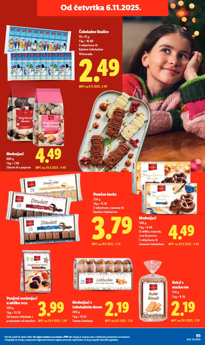 dijeli blagdansku radost svaki dan. isplati se. kolač s lješnjacima 200 g 1 kg = 17.45 božićni keksi s maslacem 300 g 1 kg = 11.30 3.49 mpc na 6.11.2025.: 3.49 3.39 mpc na 29.9.2025.: 3.39 2.29 mpc na 6.11.2025.: 2.29 spekulatius čajno pecivo 600 g 1 kg = 4.15 2.49 mpc na 13.9.2025.: 2.49 mini spekulatius keksi 200 g 1 kg = 11.45 tamna ili mliječna čokolada ponuda vrijedi do isteka zaliha. sve cijene izražene su u eurima s pdv-om. kupnja je moguća samo u količinama primjerenim za kućanstvo. fotografije ne moraju u potpunosti odgovarati stvarnom izgledu proizvoda. ispričavamo se zbog mogućih tiskarskih pogrešaka. više na www.lidl.hr od četvrtka 6.11.2025.