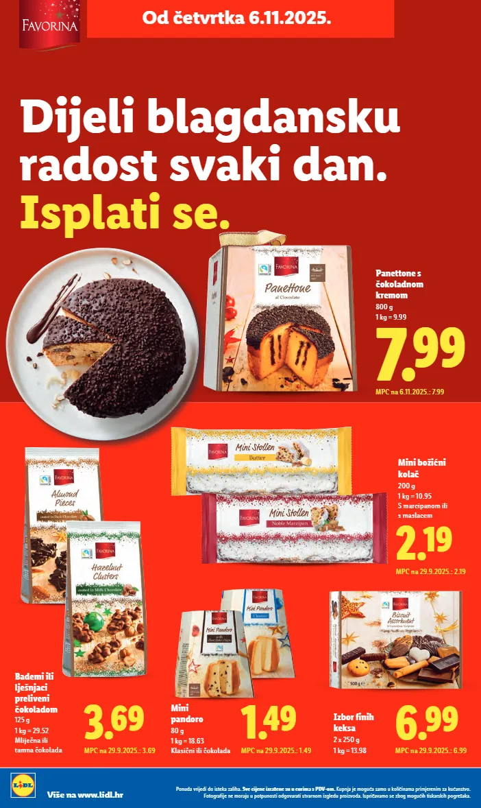 Dijeli blagdansku radost svaki dan. Isplati se. Izbor finih keksa 2 x 250 g 1 kg = 13.98 6.99 MPC na 29.9.2025.: 6.99 Panettone s čokoladnom kremom 800 g 1 kg = 9.99 Mini pandoro 80 g 1 kg = 18.63 Klasični ili čokolada 1.49 MPC na 29.9.2025.: 1.49 Bademi ili lješnjaci preliveni čokoladom 125 g 1 kg = 29.52 Mliječna ili tamna čokolada 3.69 MPC na 29.9.2025.: 3.69 Mini božićni kolač 200 g 1 kg = 10.95 S marcipanom ili s maslacem 2.19 MPC na 29.9.2025.: 2.19 7.99 MPC na 6.11.2025.: 7.99 Ponuda vrijedi do isteka zaliha. Sve cijene izražene su u eurima s PDV-om. Kupnja je moguća samo u količinama primjerenim za kućanstvo. Fotografije ne moraju u potpunosti odgovarati stvarnom izgledu proizvoda. Ispričavamo se zbog mogućih tiskarskih pogrešaka. Više na www.lidl.hr Od četvrtka 6.11.2025.