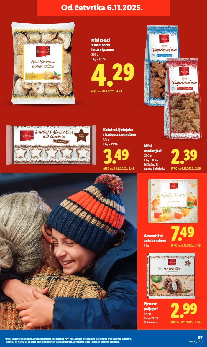93 ponuda vrijedi do isteka zaliha. sve cijene izražene su u eurima s pdv-om. kupnja je moguća samo u količinama primjerenim za kućanstvo. fotografije ne moraju u potpunosti odgovarati stvarnom izgledu proizvoda. ispričavamo se zbog mogućih tiskarskih pogrešaka. keksi s maslacem 250 g 1 kg = 8.76 medenjaci 500 g 1 kg = 8.98 u obliku zvijezda, srca ili pereca s mliječnom ili tamnom čokoladom medenjaci 600 g 1 kg = 7.48 classic ili s paprom punjeni medenjaci u obliku srca 300 g 1 kg = 13.30 od tamne čokolade s punjenjem od marelice medenjaci s čokoladnim dnom 200 g 1 kg = 10.95 tamna čokolada čokoladne lizalice 10 x 15 g 1 kg = 16.60 s mliječnom ili bijelom čokoladom 10 komada domino kocke 250 g 1 kg = 15.16 s mliječnom, tamnom ili bijelom čokoladom 4.49 mpc na 29.9.2025.: 4.49 4.49 mpc na 29.9.2025.: 4.49 3.99 mpc na 29.9.2025.: 3.99 2.19 mpc na 6.11.2025.: 2.19 2.19 mpc na 29.9.2025.: 2.19 od četvrtka 6.11.2025. 2.49 mpc na 6.11.2025.: 2.49 3.79 mpc na 29.9.2025.: 3.79 93 ponuda vrijedi do isteka zaliha. sve cijene izražene su u eurima s pdv-om. kupnja je moguća samo u količinama primjerenim za kućanstvo. fotografije ne moraju u potpunosti odgovarati stvarnom izgledu proizvoda. ispričavamo se zbog mogućih tiskarskih pogrešaka. nac 45/2025