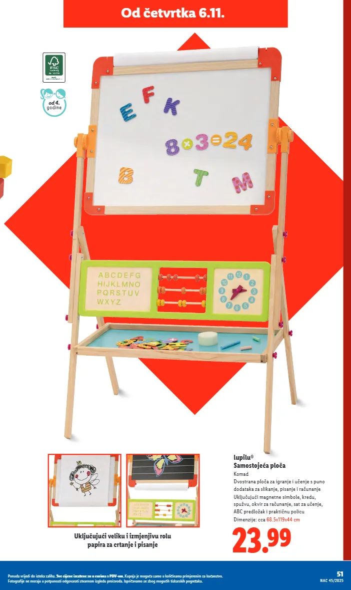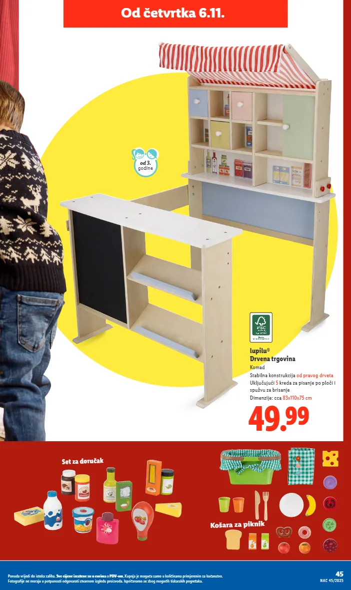 od četvrtka 6.11. do 9.11. izdanje 45/2025 ponuda vrijedi do isteka zaliha. sve cijene izražene su u eurima s pdv-om. kupnja je moguća samo u količinama primjerenim za kućanstvo. fotografije ne moraju u potpunosti odgovarati stvarnom izgledu proizvoda. ispričavamo se zbog mogućih tiskarskih pogrešaka. više na www.lidl.hr štedi uz super ponude iz lidla. isplati se. lupilu® drvena kuhinja komad stabilna konstrukcija od pravog drveta 55.- super ponuda 3.35 -30% 4.79 mpc na 2.5.2025.: 4.79 ocean sea filet oslića 500 g 1 kg = 6.70 do -44% na odabrane proizvode 0.99 -44% 1.79 mpc na 2.5.2025.: 1.79 vita d'or biljni margarin 500 g 1 kg = 1.98 3.99 super cijena! mpc na 2.5.2025.: 4.29 lino čokolino 600 g 1 kg = 6.65 0.77 kg mpc na 18.9.2025.: 1.49 domaća mandarina svježi mesni uštipci sa sirom 400 g 1 kg = 6.63 3.79 2.65 -30% uz lidl plus mpc na 2.5.2025.: 3.79