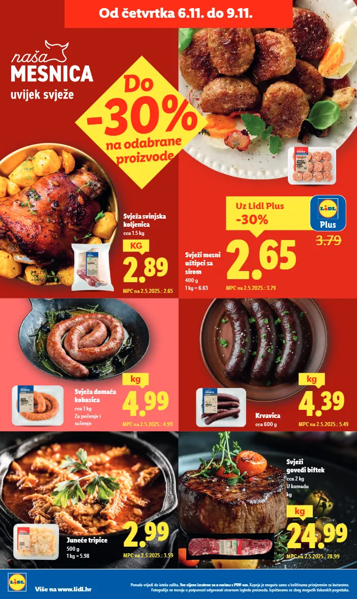 svježi mesni uštipci sa sirom 400 g 1 kg = 6.63 svježi goveđi biftek cca 2 kg u komadu kg 2.99 mpc na 2.5.2025.: 3.59 juneće tripice 500 g 1 kg = 5.98 do -30% na odabrane proizvode uz lidl plus -30% 2.65 3.79 mpc na 2.5.2025.: 3.79 2.89 kg mpc na 2.5.2025.: 2.65 svježa svinjska koljenica cca 1.5 kg svježa domaća kobasica cca 1 kg za pečenje i sušenje krvavica cca 600 g 4.99 kg mpc na 2.5.2025.: 4.99 4.39 kg mpc na 2.5.2025.: 5.49 24.99 kg mpc na 2.5.2025.: 28.99 ponuda vrijedi do isteka zaliha. sve cijene izražene su u eurima s pdv-om. kupnja je moguća samo u količinama primjerenim za kućanstvo. fotografije ne moraju u potpunosti odgovarati stvarnom izgledu proizvoda. ispričavamo se zbog mogućih tiskarskih pogrešaka. više na www.lidl.hr ponuda vrijedi do isteka zaliha. sve cijene izražene su u eurima s pdv-om. kupnja je moguća samo u količinama primjerenim za kućanstvo. fotografije ne moraju u potpunosti odgovarati stvarnom izgledu proizvoda. ispričavamo se zbog mogućih tiskarskih pogrešaka. više na www.lidl.hr od četvrtka 6.11. do 9.11.