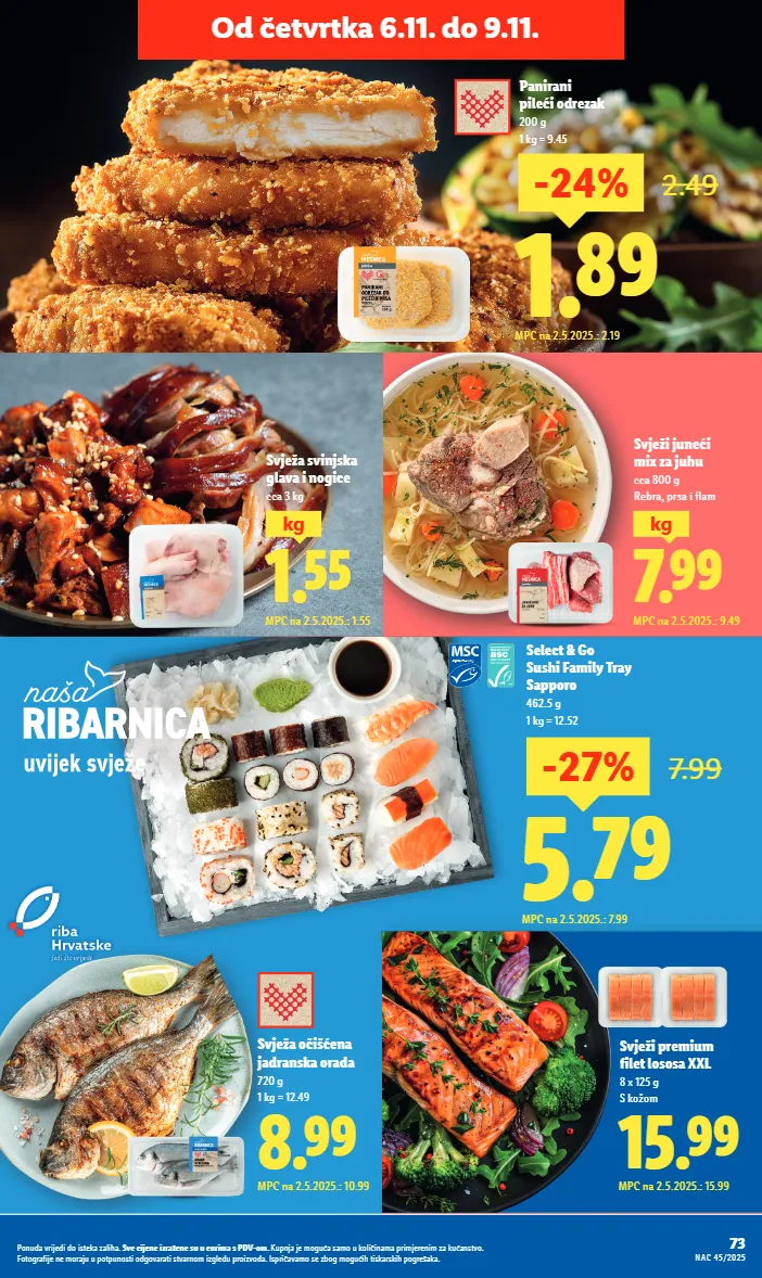 svježi premium filet lososa xxl 8 x 125 g s kožom 15.99 mpc na 2.5.2025.: 15.99 select & go sushi family tray sapporo 462.5 g 1 kg = 12.52 1.89 2.49 mpc na 2.5.2025.: 2.19 -24% 5.79 7.99 mpc na 2.5.2025.: 7.99 -27% panirani pileći odrezak 200 g 1 kg = 9.45 svježi juneći mix za juhu cca 800 g rebra, prsa i flam 7.99 kg mpc na 2.5.2025.: 9.49 svježa svinjska glava i nogice cca 3 kg 1.55 kg mpc na 2.5.2025.: 1.55 8.99 mpc na 2.5.2025.: 10.99 svježa očišćena jadranska orada 720 g 1 kg = 12.49 73 nac 37/2025 ponuda vrijedi do isteka zaliha. sve cijene izražene su u eurima s pdv-om. kupnja je moguća samo u količinama primjerenim za kućanstvo. fotografije ne moraju u potpunosti odgovarati stvarnom izgledu proizvoda. ispričavamo se zbog mogućih tiskarskih pogrešaka. 73 ponuda vrijedi do isteka zaliha. sve cijene izražene su u eurima s pdv-om. kupnja je moguća samo u količinama primjerenim za kućanstvo. fotografije ne moraju u potpunosti odgovarati stvarnom izgledu proizvoda. ispričavamo se zbog mogućih tiskarskih pogrešaka. nac 45/2025 od četvrtka 6.11. do 9.11.
