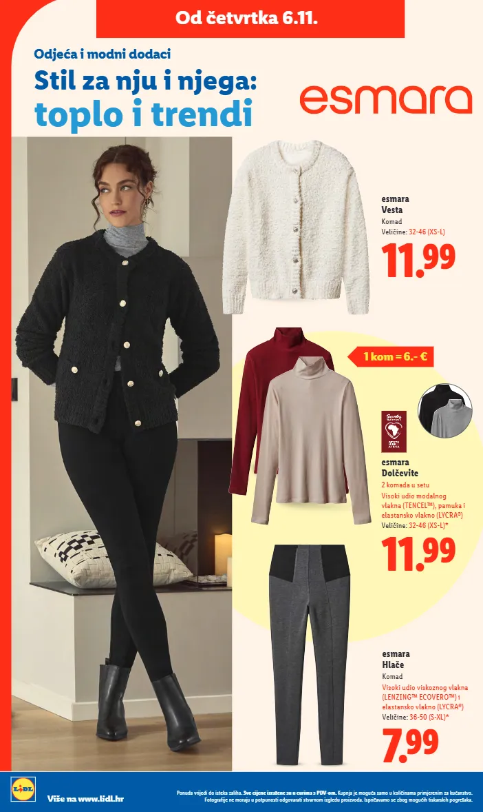 stil za nju i njega: toplo i trendi odjeća i modni dodaci od četvrtka 6.11. esmara vesta komad veličine: 32-46 (xs-l) 11.99 1 kom = 6.- € esmara dolčevite 2 komada u setu visoki udio modalnog vlakna (tencel™), pamuka i elastansko vlakno (lycra®) veličine: 32-46 (xs-l)* 11.99 esmara hlače komad visoki udio viskoznog vlakna ( lenzing™ ecovero™ ) i elastansko vlakno (lycra®) veličine: 36-50 (s-xl)* 7.99 ponuda vrijedi do isteka zaliha. sve cijene izražene su u eurima s pdv-om. kupnja je moguća samo u količinama primjerenim za kućanstvo. fotografije ne moraju u potpunosti odgovarati stvarnom izgledu proizvoda. ispričavamo se zbog mogućih tiskarskih pogrešaka. više na www.lidl.hr