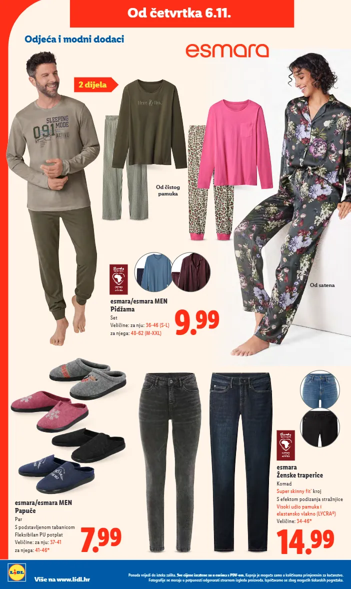 od četvrtka 6.11. odjeća i modni dodaci esmara ženske traperice komad super skinny fit' kroj s efektom podizanja stražnjice visoki udio pamuka i elastansko vlakno (lycra®) veličine: 34-46* 14.99 esmara/esmara men pidžama set veličine: za nju: 36-46 (s-l) za njega: 48-62 (m-xxl) 9.99 2 dijela esmara/esmara men papuče par s podstavljenom tabanicom fleksibilan pu potplat veličine: za nju: 37-41 za njega: 41-46* 7.99 od čistog pamuka od satena ponuda vrijedi do isteka zaliha. sve cijene izražene su u eurima s pdv-om. kupnja je moguća samo u količinama primjerenim za kućanstvo. fotografije ne moraju u potpunosti odgovarati stvarnom izgledu proizvoda. ispričavamo se zbog mogućih tiskarskih pogrešaka. više na www.lidl.hr