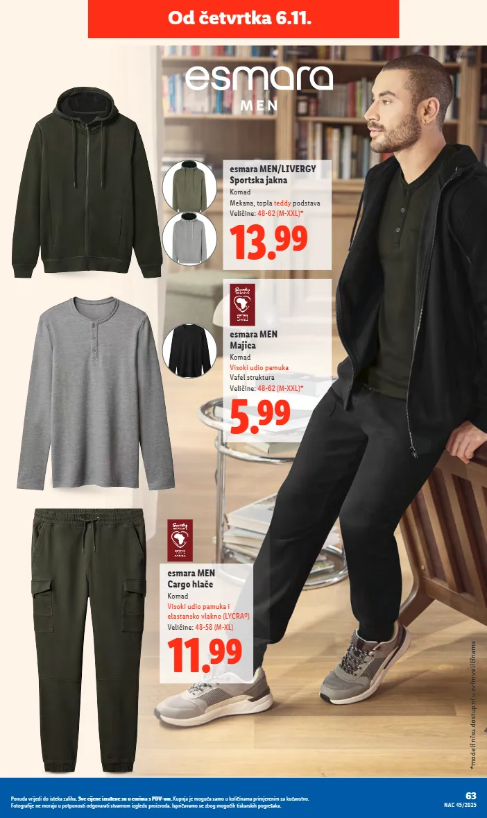 od četvrtka 6.11. esmara men/livergy sportska jakna komad mekana, topla teddy podstava veličine: 48-62 (m-xxl)* 13.99 esmara men cargo hlače komad visoki udio pamuka i elastansko vlakno (lycra®) veličine: 48-58 (m-xl) 11.99 *modeli nisu dostupni u svim veličinama esmara men majica komad visoki udio pamuka vafel struktura veličine: 48-62 (m-xxl)* 5.99 63 nac 45/2025 ponuda vrijedi do isteka zaliha. sve cijene izražene su u eurima s pdv-om. kupnja je moguća samo u količinama primjerenim za kućanstvo. fotografije ne moraju u potpunosti odgovarati stvarnom izgledu proizvoda. ispričavamo se zbog mogućih tiskarskih pogrešaka.