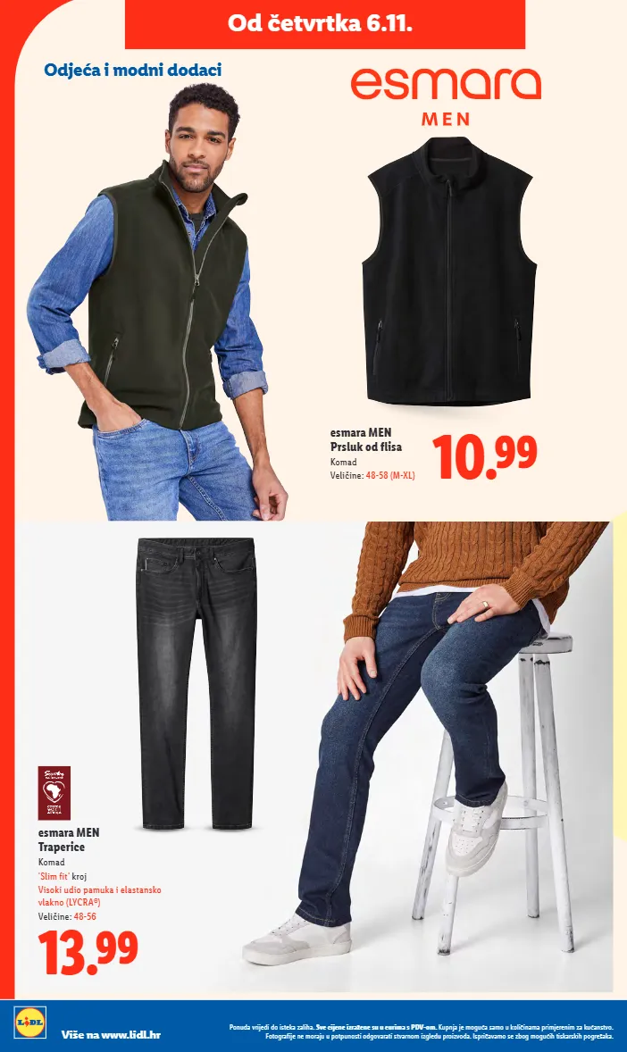 Od četvrtka 6.11. esmara MEN Traperice Komad 'Slim fit' kroj Visoki udio pamuka i elastansko vlakno (LYCRA®) Veličine: 48-56 13.99 esmara MEN Prsluk od flisa Komad Veličine: 48-58 (M-XL) 10.99 Odjeća i modni dodaci Ponuda vrijedi do isteka zaliha. Sve cijene izražene su u eurima s PDV-om. Kupnja je moguća samo u količinama primjerenim za kućanstvo. Fotografije ne moraju u potpunosti odgovarati stvarnom izgledu proizvoda. Ispričavamo se zbog mogućih tiskarskih pogrešaka. Više na www.lidl.hr