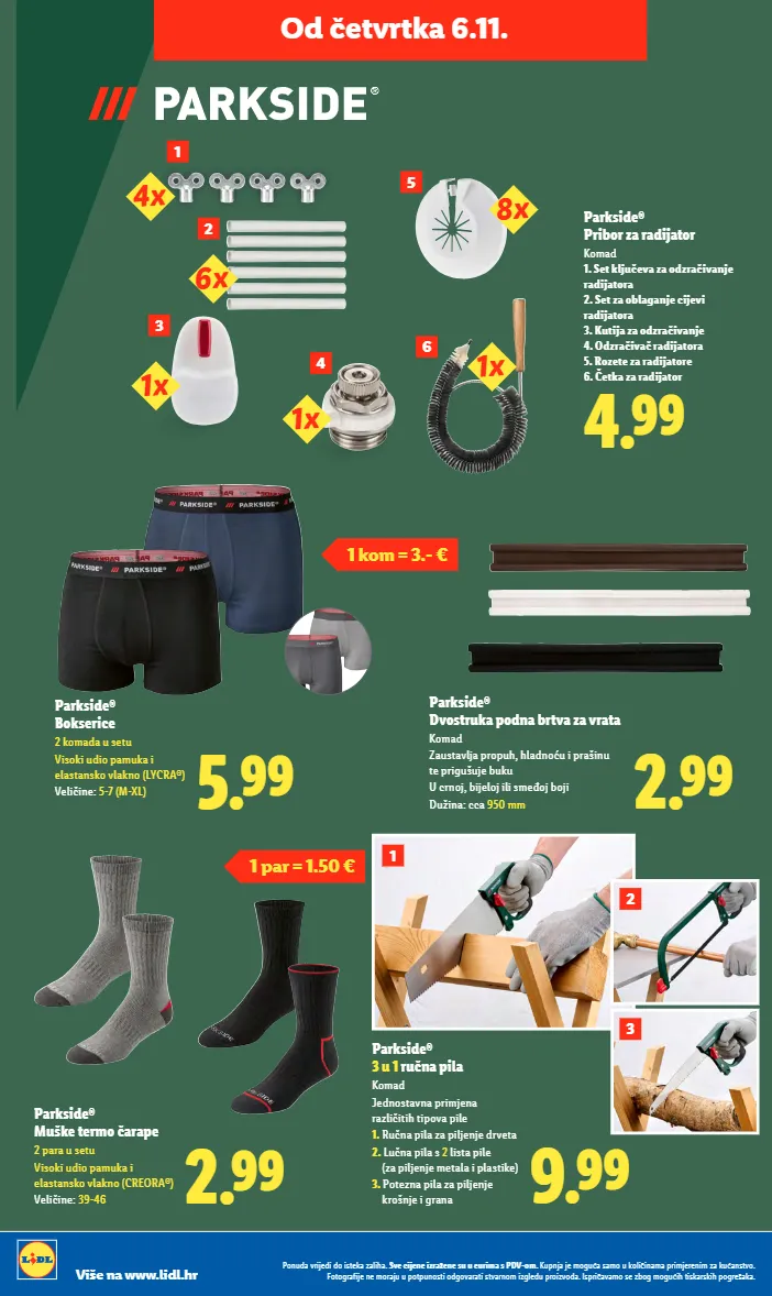 parkside® bokserice 2 komada u setu visoki udio pamuka i elastansko vlakno (lycra®) veličine: 5-7 (m-xl) 5.99 parkside® muške termo čarape 2 para u setu visoki udio pamuka i elastansko vlakno (creora®) veličine: 39-46 2.99 parkside® dvostruka podna brtva za vrata komad zaustavlja propuh, hladnoću i prašinu te prigušuje buku u crnoj, bijeloj ili smeđoj boji dužina: cca 950 mm 2.99 parkside® 3 u 1 ručna pila komad jednostavna primjena različitih tipova pile 1. ručna pila za piljenje drveta 2. lučna pila s 2 lista pile (za piljenje metala i plastike) 3. potezna pila za piljenje krošnje i grana 9.99 parkside® pribor za radijator komad 1. set ključeva za odzračivanje radijatora 2. set za oblaganje cijevi radijatora 3. kutija za odzračivanje 4. odzračivač radijatora 5. rozete za radijatore 6. četka za radijator 4.99 1 kom = 3.- € 4x 6x 8x 1x 1x 1x 1 2 3 4 5 6 3 2 1 od četvrtka 6.11. 1 par = 1.50 € ponuda vrijedi do isteka zaliha. sve cijene izražene su u eurima s pdv-om. kupnja je moguća samo u količinama primjerenim za kućanstvo. fotografije ne moraju u potpunosti odgovarati stvarnom izgledu proizvoda. ispričavamo se zbog mogućih tiskarskih pogrešaka. više na www.lidl.hr