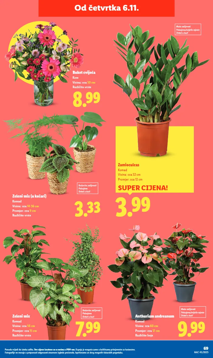 Od četvrtka 6.11. Ponuda vrijedi do isteka zaliha. Sve cijene izražene su u eurima s PDV-om. Kupnja je moguća samo u količinama primjerenim za kućanstvo. Fotografije ne moraju u potpunosti odgovarati stvarnom izgledu proizvoda. Ispričavamo se zbog mogućih tiskarskih pogrešaka. 8.99 Buket cvijeća Kom Visina: cca 50 cm Različite vrste 3.99 SUPER CIJENA! Zamioculcas Komad Visina: cca 32 cm Promjer: cca 12 cm Malo zalijevati Polusjena/svijetlo mjesto Držati u kući 3.33 Zeleni mix (u košari) Komad Visina: cca 14-36 cm Promjer: cca 9 cm Različite vrste 7.99 Zeleni mix Komad Visina: cca 56 cm Promjer: cca 15 cm Različite vrste Malo zalijevati Polusjena/svijetlo mjesto Držati u kući 69 NAC 45/2025 Ponuda vrijedi do isteka zaliha. Sve cijene izražene su u eurima s PDV-om. Kupnja je moguća samo u količinama primjerenim za kućanstvo. Fotografije ne moraju u potpunosti odgovarati stvarnom izgledu proizvoda. Ispričavamo se zbog mogućih tiskarskih pogrešaka. Redovito zalijevati Polusjena Držati u kući 9.99 Anthurium andreanum Komad Visina: cca 60 cm Promjer: cca 17 cm Različite boje Redovito zalijevati Polusjena Držati u kući