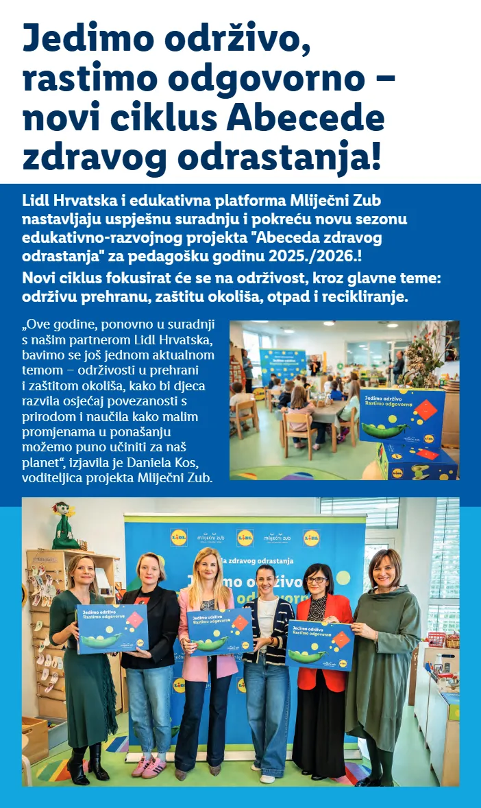 „Ove godine, ponovno u suradnji s našim partnerom Lidl Hrvatska, bavimo se još jednom aktualnom temom – održivosti u prehrani i zaštitom okoliša, kako bi djeca razvila osjećaj povezanosti s prirodom i naučila kako malim promjenama u ponašanju možemo puno učiniti za naš planet“, izjavila je Daniela Kos, voditeljica projekta Mliječni Zub. Jedimo održivo, rastimo odgovorno – novi ciklus Abecede zdravog odrastanja! Lidl Hrvatska i edukativna platforma Mliječni Zub nastavljaju uspješnu suradnju i pokreću novu sezonu edukativno-razvojnog projekta "Abeceda zdravog odrastanja" za pedagošku godinu 2025./2026.! Novi ciklus fokusirat će se na održivost, kroz glavne teme: održivu prehranu, zaštitu okoliša, otpad i recikliranje.