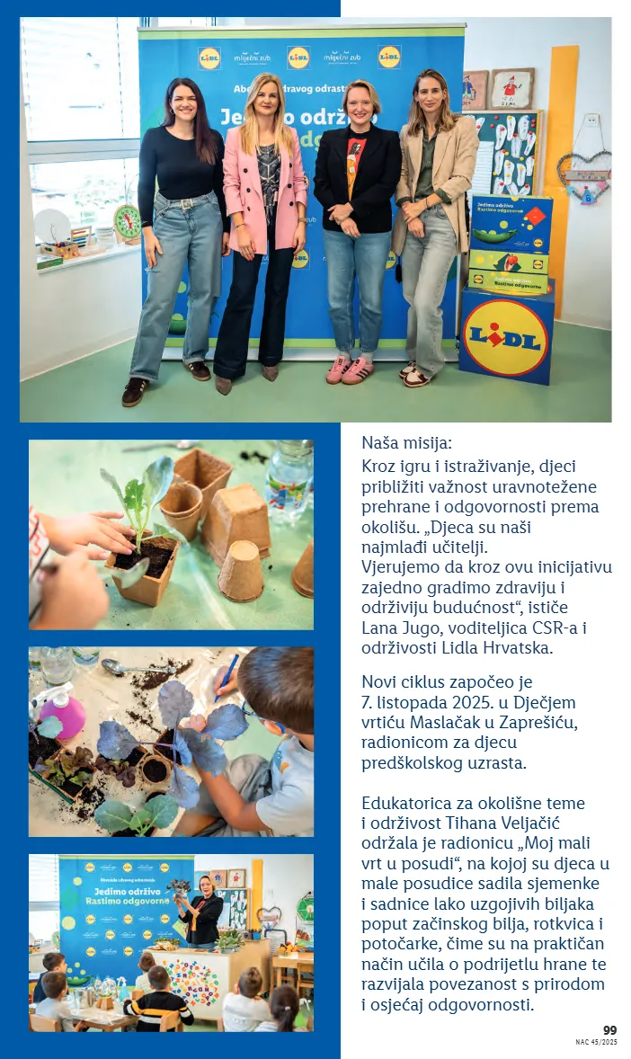 Novi ciklus započeo je 7. listopada 2025. u Dječjem vrtiću Maslačak u Zaprešiću, radionicom za djecu predškolskog uzrasta. Edukatorica za okolišne teme i održivost Tihana Veljačić održala je radionicu „Moj mali vrt u posudi“, na kojoj su djeca u male posudice sadila sjemenke i sadnice lako uzgojivih biljaka poput začinskog bilja, rotkvica i potočarke, čime su na praktičan način učila o podrijetlu hrane te razvijala povezanost s prirodom i osjećaj odgovornosti. 99 NAC 45/2025 Naša misija: Kroz igru i istraživanje, djeci približiti važnost uravnotežene prehrane i odgovornosti prema okolišu. „Djeca su naši najmlađi učitelji. Vjerujemo da kroz ovu inicijativu zajedno gradimo zdraviju i održiviju budućnost“, ističe Lana Jugo, voditeljica CSR-a i održivosti Lidla Hrvatska.
