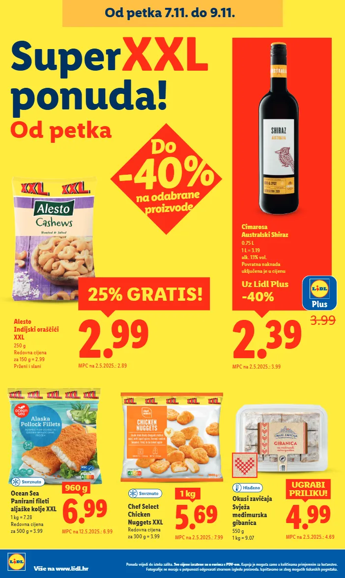 Do -40% na odabrane proizvode Uz Lidl Plus -40% 2.39 3.99 Cimarosa Australski Shiraz 0.75 L 1 L = 3.19 alk. 13% vol. Povratna naknada uključena je u cijenu MPC na 2.5.2025.: 3.99 5.69 1 kg MPC na 2.5.2025.: 7.99 Chef Select Chicken Nuggets XXL Redovna cijena za 300 g = 3.99 4.99 UGRABI PRILIKU! MPC na 2.5.2025.: 4.69 Okusi zavičaja Svježa međimurska gibanica 550 g 1 kg = 9.07 Alesto Indijski oraščići XXL 250 g Redovna cijena za 150 g = 2.99 Prženi i slani Ocean Sea Panirani fileti aljaške kolje XXL 1 kg = 7.28 Redovna cijena za 500 g = 3.99 6.99 960 g MPC na 12.5.2025.: 6.99 2.99 MPC na 2.5.2025.: 2.89 25% GRATIS! Super ponuda! Od petka XXL Ponuda vrijedi do isteka zaliha. Sve cijene izražene su u eurima s PDV-om. Kupnja je moguća samo u količinama primjerenim za kućanstvo. Fotografije ne moraju u potpunosti odgovarati stvarnom izgledu proizvoda. Ispričavamo se zbog mogućih tiskarskih pogrešaka. Više na www.lidl.hr Od petka 7.11. do 9.11.