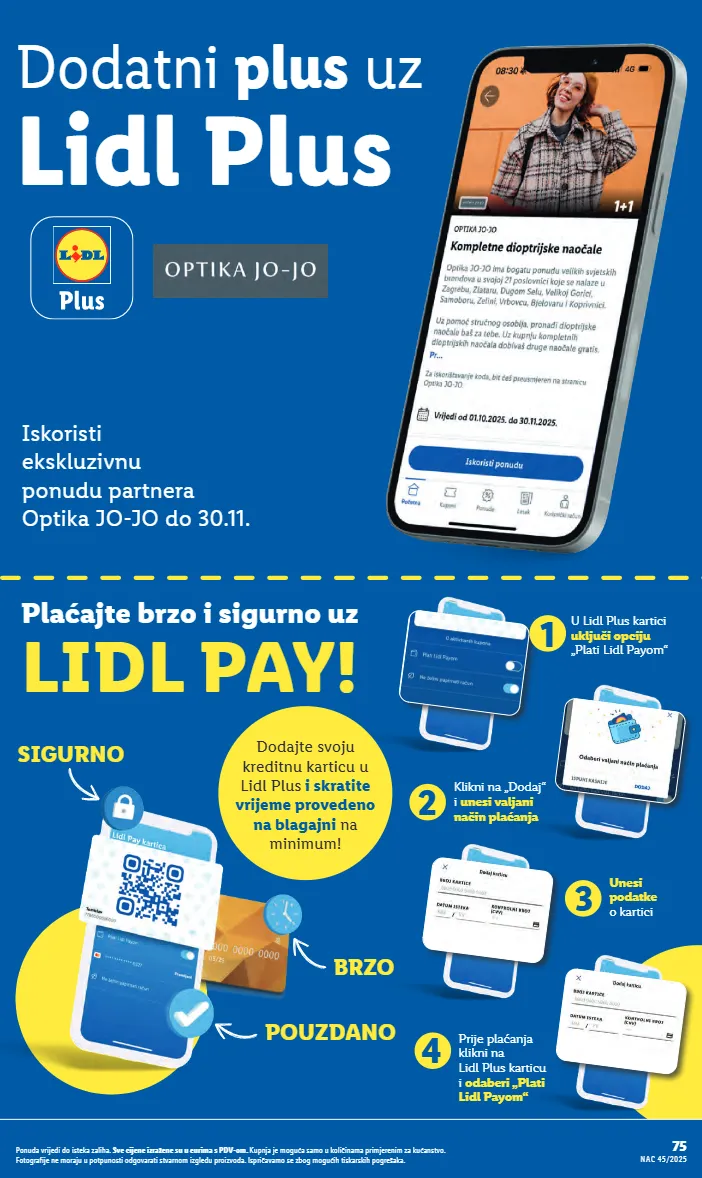 LIDL PAY! Plaćajte brzo i sigurno uz Dodajte svoju kreditnu karticu u Lidl Plus i skratite vrijeme provedeno na blagajni na minimum! SIGURNO POUZDANO BRZO Prije plaćanja klikni na Lidl Plus karticu i odaberi „Plati Lidl Payom“ 4 Klikni na „Dodaj“ i unesi valjani način plaćanja 2 U Lidl Plus kartici uključi opciju „Plati Lidl Payom“ 1 Unesi podatke o kartici 3 75 Ponuda vrijedi do isteka zaliha. Sve cijene izražene su u eurima s PDV-om. Kupnja je moguća samo u količinama primjerenim za kućanstvo. Fotografije ne moraju u potpunosti odgovarati stvarnom izgledu proizvoda. Ispričavamo se zbog mogućih tiskarskih pogrešaka. NAC 45/2025 Dodatni plus uz Lidl Plus Iskoristi ekskluzivnu ponudu partnera Optika JO-JO do 30.11.