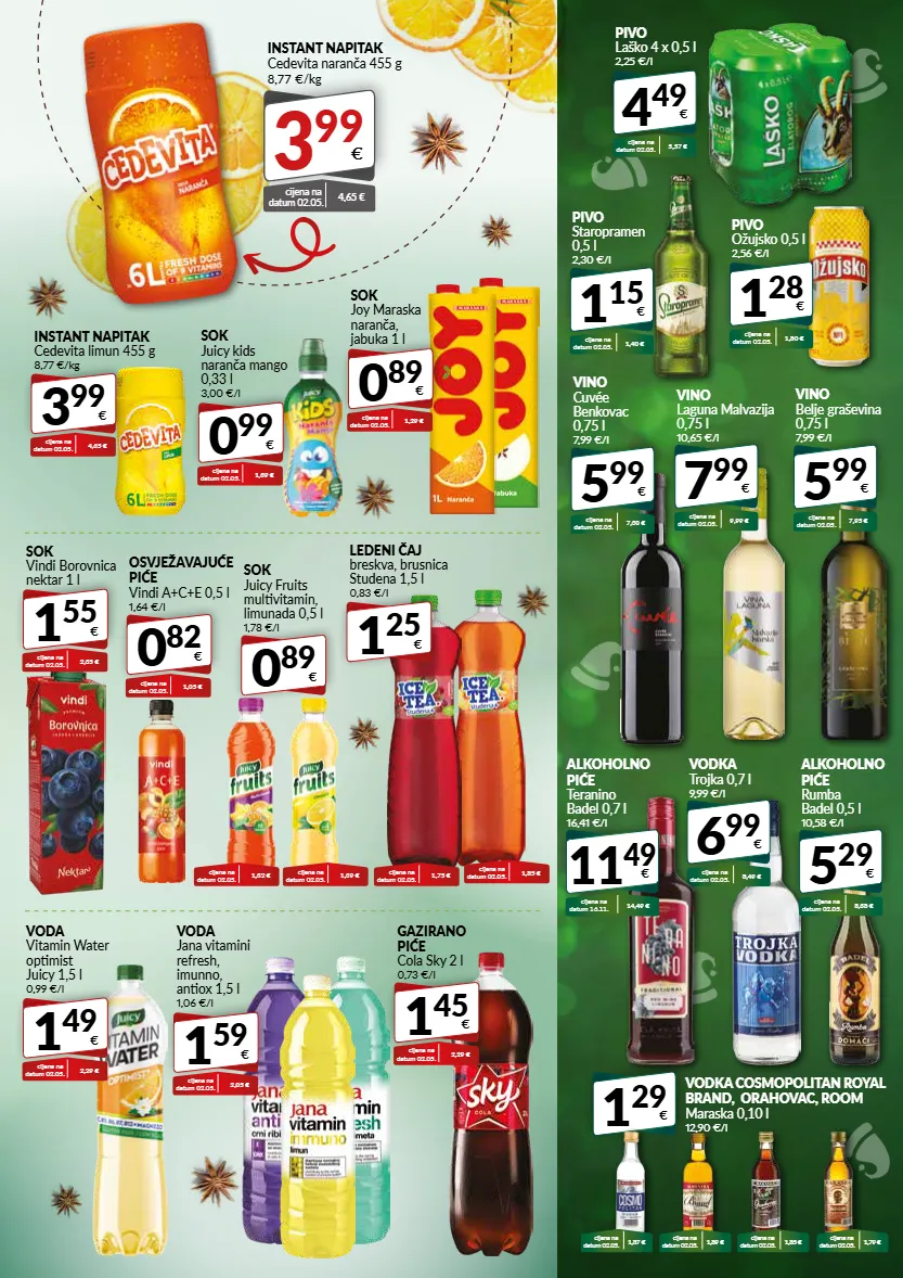 instant napitak cedevita naranča 455 g 8,77 €/kg 3 99 € cijena na datum 02.05. 4,65 € 3 99 € instant napitak cedevita limun 455 g 8,77 €/kg cijena na datum 02.05. 4,65 € 1 45 € gazirano piće cola sky 2 l 0,73 €/l cijena na datum 02.05. 2,29 € 1 25 € ledeni čaj breskva, brusnica studena 1,5 l 0,83 €/l 1 59 € voda jana vitamini refresh, imunno, antiox 1,5 l 1,06 €/l cijena na datum 02.05. 2,05 € 1 49 € voda vitamin water optimist juicy 1,5 l 0,99 €/l cijena na datum 02.05. 2,29 € cijena na datum 02.05. 1,85 € cijena na datum 02.05. 1,75 € osvježavajuće piće vindi a+c+e 0,5 l 1,64 €/l 0 82 € cijena na datum 02.05. 1,05 € 1 55 € sok vindi borovnica nektar 1 l cijena na datum 02.05. 2,35 € sok juicy kids naranča mango 0,33 l 3,00 €/l 0 99 € cijena na datum 02.05. 1,39 € sok joy maraska naranča, jabuka 1 l 0 89 € cijena na datum 02.05. 1,29 € sok juicy fruits multivitamin, limunada 0,5 l 1,78 €/l 0 89 € cijena na datum 02.05. 1,32 € cijena na datum 02.05. 1,39 € pivo laško 4 x 0,5 l 2,25 €/l 4 49 € cijena na datum 02.05. 5,57 € pivo ožujsko 0,5 l 2,56 €/l 1 28 € cijena na datum 02.05. 1,80 € vino cuvée benkovac 0,75 l 7,99 €/l 5 99 € cijena na datum 02.05. 7,30 € vodka trojka 0,7 l 9,99 €/l 6 99 € cijena na datum 02.05. 8,49 € alkoholno piće rumba badel 0,5 l 10,58 €/l 5 29 € cijena na datum 02.05. 8,38 € vino laguna malvazija 0,75 l 10,65 €/l 7 99 € cijena na datum 02.05. 9,99 € vino belje graševina 0,75 l 7,99 €/l 5 99 € cijena na datum 02.05. 7,95 € vodka cosmopolitan royal brand, orahovac, room maraska 0,10 l 12,90 €/l 1 29 € pivo staropramen 0,5 l 2,30 €/l 1 15 € cijena na datum 02.05. 1,40 € cijena na datum 02.05. 1,87 € cijena na datum 02.05. 1,89 € cijena na datum 02.05. 1,85 € cijena na datum 02.05. 1,79 € alkoholno piće teranino badel 0,7 l 16,41 €/l 11 49 € cijena na datum 16.11. 14,49 €
