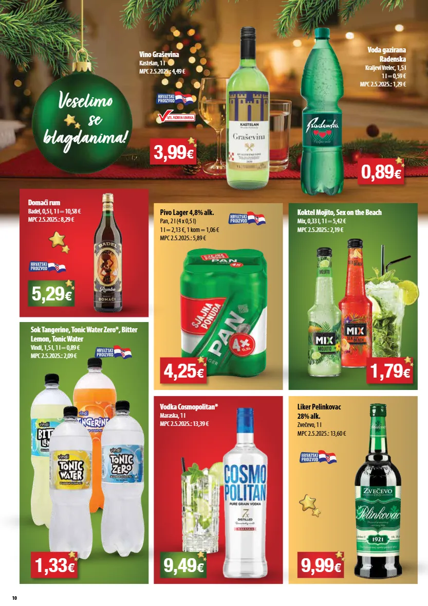 veselimo se blagdanima! 10 pivo lager 4,8% alk. pan, 2 l (4 x 0,5 l) 1 l = 2,13 €, 1 kom = 1,06 € mpc 2.5.2025.: 5,89 € vino graševina kastelan, 1 l mpc 2.5.2025.: 4,49 € domaći rum badel, 0,5 l, 1 l = 10,58 € mpc 2.5.2025.: 8,29 € liker pelinkovac 28% alk. zvečevo, 1 l mpc 2.5.2025.: 13,60 € koktel mojito, sex on the beach mix, 0,33 l, 1 l = 5,42 € mpc 2.5.2025.: 2,19 € vodka cosmopolitan* maraska, 1 l mpc 2.5.2025.: 13,39 € voda gazirana radenska kraljevi vrelec, 1,5 l 1 l = 0,59 € mpc 2.5.2025.: 1,29 € sok tangerine, tonic water zero*, bitter lemon, tonic water vindi, 1,5 l, 1 l = 0,89 € mpc 2.5.2025.: 2,09 € 5,29 € 4,25 € 1,79 € 1,33 € 9,49 € 9,99 € 3,99 € 0,89 €