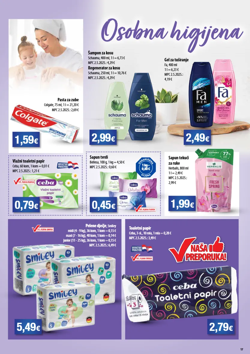 osobna higijena 1 kg= 0,80 € 17 1,99 € 1,59 € 2,49 € 0,45 € 0,79 € 2,79 € 5,49 € 2,99 € sapun tekući za ruke herbalis, 800 ml 1 l = 2,49 € mpc 2.5.2025.: 2,99 € pasta za zube colgate, 75 ml, 1 l = 21,20 € mpc 2.5.2025.: 2,69 € gel za tuširanje fa, 400 ml 1 l = 6,23 € mpc 2.5.2025.: 4,19 € sapun tvrdi bellesa, 100 g, 1 kg = 4,50 € mpc 2.5.2025.: 0,60 € vlažni toaletni papir ceba, 60 kom, 1 kom = 0,01 € mpc 2.5.2025.: 1,21 € toaletni papir ceba, 3-sl., 10 rola, 1 rola = 0,28 € mpc 2.5.2025.: 3,49 € pelene dječje , smiley midi (4 - 9 kg), 36 kom, 1 kom = 0,15 € maxi (7 - 16 kg), 40 kom, 1 kom = 0,14 € junior (11 - 25 kg), 36 kom, 1 kom = 0,15 € mpc 2.5.2025.: 6,49 € šampon za kosu schauma, 400 ml, 1 l = 6,73 € mpc 2.5.2025.: 4,29 € regenerator za kosu schauma, 250 ml, 1 l = 10,76 € mpc 2.5.2025.: 4,29 €