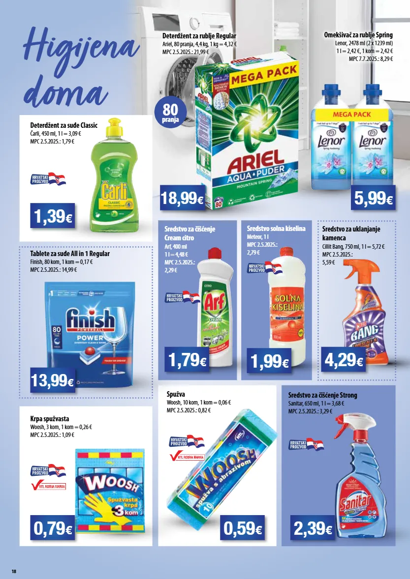 18 0,79 € 0,59 € krpa spužvasta woosh, 3 kom, 1 kom = 0,26 € mpc 2.5.2025.: 1,09 € spužva woosh, 10 kom, 1 kom = 0,06 € mpc 2.5.2025.: 0,82 € 18,99 € 13,99 € 5,99 € 4,29 € 1,39 € 2,39 € 1,99 € 1,79 € deterdžent za rublje regular ariel, 80 pranja, 4,4 kg, 1 kg = 4,32 € mpc 2.5.2025.: 21,99 € tablete za suđe all in 1 regular finish, 80 kom, 1 kom = 0,17 € mpc 2.5.2025.: 14,99 € omekšivač za rublje spring lenor, 2478 ml (2 x 1239 ml) 1 l = 2,42 €, 1 kom = 2,42 € mpc 7.7.2025.: 8,29 € sredstvo za uklanjanje kamenca cillit bang, 750 ml, 1 l = 5,72 € mpc 2.5.2025.: 5,59 € deterdžent za suđe classic čarli, 450 ml, 1 l = 3,09 € mpc 2.5.2025.: 1,79 € sredstvo za čišćenje strong sanitar, 650 ml, 1 l = 3,68 € mpc 2.5.2025.: 3,29 € sredstvo solna kiselina meteor, 1 l mpc 2.5.2025.: 2,79 € sredstvo za čišćenje cream citro arf, 400 ml 1 l = 4,48 € mpc 2.5.2025.: 2,29 € higijena doma 80 pranja