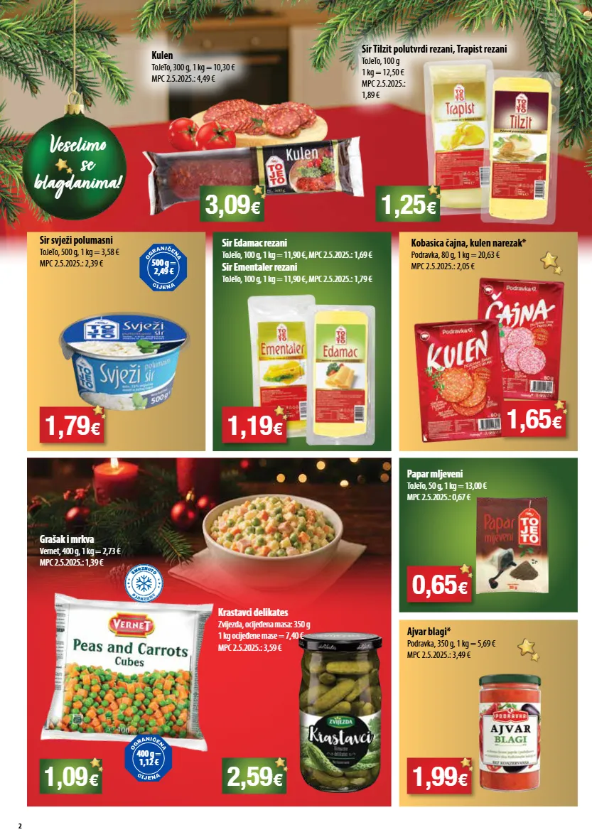 veselimo se blagdanima! 2 sir svježi polumasni tojeto, 500 g, 1 kg = 3,58 € mpc 2.5.2025.: 2,39 € sir edamac rezani tojeto, 100 g, 1 kg = 11,90 €, mpc 2.5.2025.: 1,69 € sir ementaler rezani tojeto, 100 g, 1 kg = 11,90 €, mpc 2.5.2025.: 1,79 € sir tilzit polutvrdi rezani, trapist rezani tojeto, 100 g 1 kg = 12,50 € mpc 2.5.2025.: 1,89 € 500 g = 2,49 € ajvar blagi* podravka, 350 g, 1 kg = 5,69 € mpc 2.5.2025.: 3,49 € krastavci delikates zvijezda, ocijeđena masa: 350 g 1 kg ocijeđene mase = 7,40 € mpc 2.5.2025.: 3,59 € papar mljeveni tojeto, 50 g, 1 kg = 13,00 € mpc 2.5.2025.: 0,67 € kobasica čajna, kulen narezak* podravka, 80 g, 1 kg = 20,63 € mpc 2.5.2025.: 2,05 € kulen tojeto, 300 g, 1 kg = 10,30 € mpc 2.5.2025.: 4,49 € grašak i mrkva vernet, 400 g, 1 kg = 2,73 € mpc 2.5.2025.: 1,39 € s m r z n u t o s m r z n u t o 1,09 € 2,59 € 0,65 € 1,65 € 1,19 € 3,09 € 1,25 € 1,79 € 1,99 € 400 g = 1,12 €