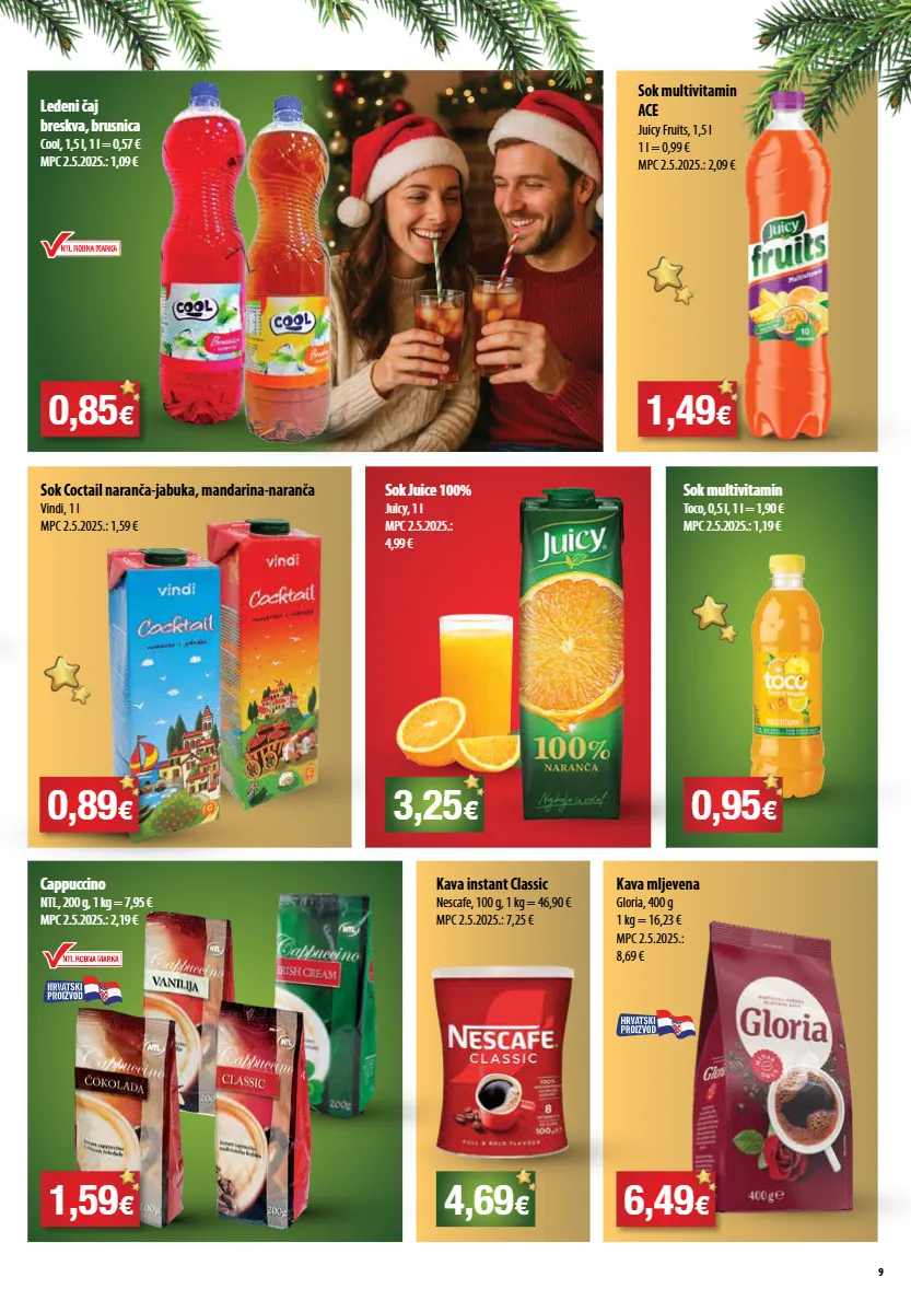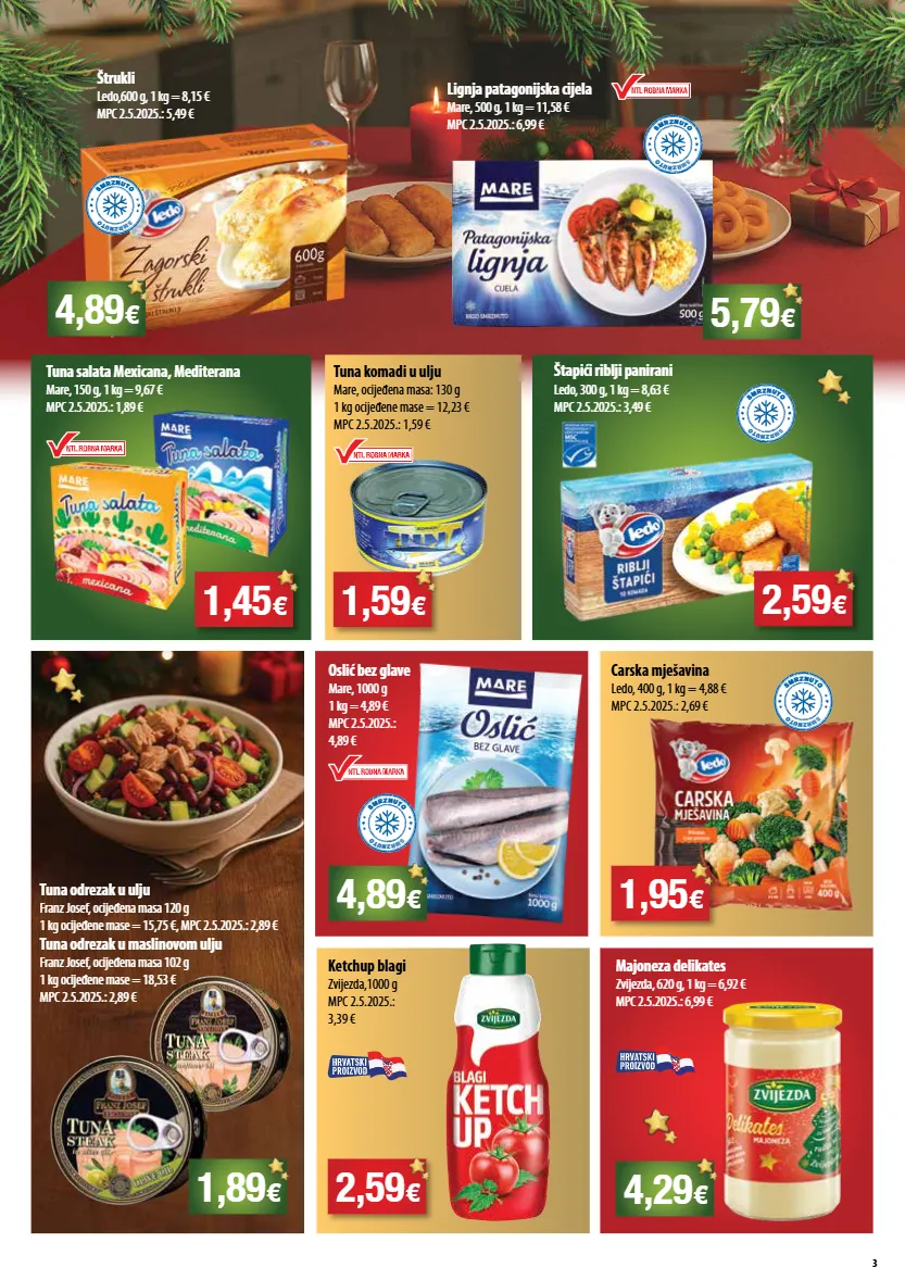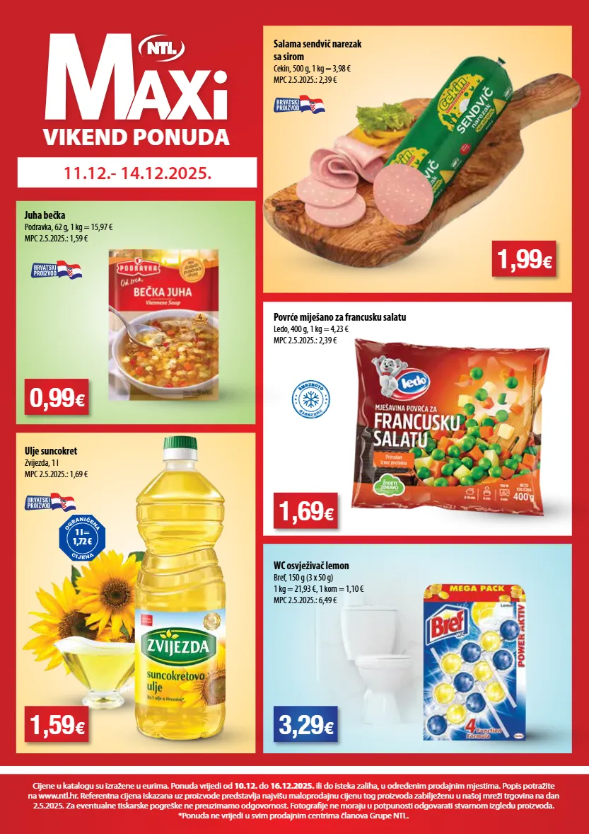 cijene u katalogu su izražene u eurima. ponuda vrijedi od 10.12. do 16.12.2025. ili do isteka zaliha, u određenim prodajnim mjestima. popis potražite na www.ntl.hr. referentna cijena iskazana uz proizvode predstavlja najvišu maloprodajnu cijenu tog proizvoda zabilježenu u našoj mreži trgovina na dan 2.5.2025. za eventualne tiskarske pogreške ne preuzimamo odgovornost. fotografije ne moraju u potpunosti odgovarati stvarnom izgledu proizvoda. *ponuda ne vrijedi u svim prodajnim centrima članova grupe ntl. 11.12.- 14.12.2025. vikend ponuda 1,69 € 1,99 € 3,29 € 0,99 € 1,59 € povrće miješano za francusku salatu ledo, 400 g, 1 kg = 4,23 € mpc 2.5.2025.: 2,39 € salama sendvič narezak sa sirom cekin, 500 g, 1 kg = 3,98 € mpc 2.5.2025.: 2,39 € wc osvježivač lemon bref, 150 g (3 x 50 g) 1 kg = 21,93 €, 1 kom = 1,10 € mpc 2.5.2025.: 6,49 € juha bečka podravka, 62 g, 1 kg = 15,97 € mpc 2.5.2025.: 1,59 € ulje suncokret zvijezda, 1 l mpc 2.5.2025.: 1,69 € 1 l = 1,72 € s m r z n u t o s m r z n u t o