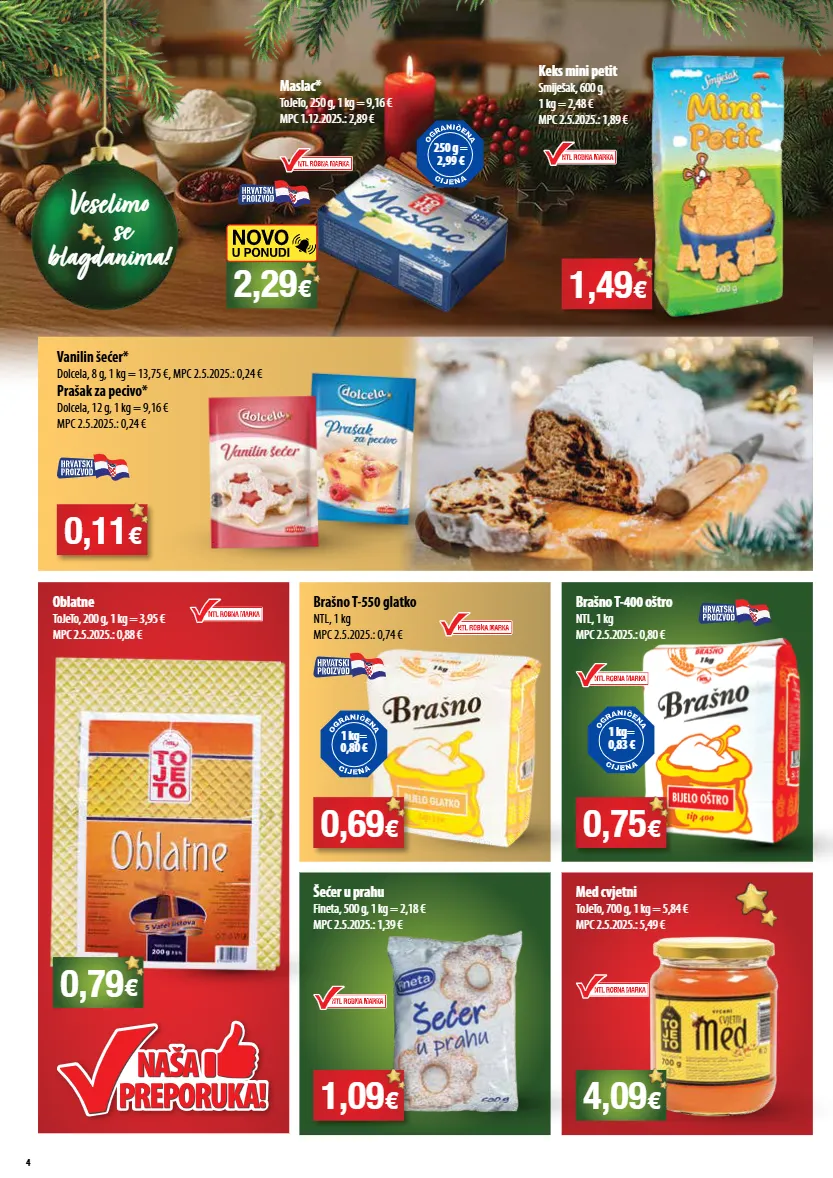 veselimo se blagdanima! 4 oblatne tojeto, 200 g, 1 kg = 3,95 € mpc 2.5.2025.: 0,88 € keks mini petit smiješak, 600 g 1 kg = 2,48 € mpc 2.5.2025.: 1,89 € šećer u prahu fineta, 500 g, 1 kg = 2,18 € mpc 2.5.2025.: 1,39 € vanilin šećer* dolcela, 8 g, 1 kg = 13,75 €, mpc 2.5.2025.: 0,24 € prašak za pecivo* dolcela, 12 g, 1 kg = 9,16 € mpc 2.5.2025.: 0,24 € maslac* tojeto, 250 g, 1 kg = 9,16 € mpc 1.12.2025.: 2,89 € med cvjetni tojeto, 700 g, 1 kg = 5,84 € mpc 2.5.2025.: 5,49 € brašno t-550 glatko ntl, 1 kg mpc 2.5.2025.: 0,74 € brašno t-400 oštro ntl, 1 kg mpc 2.5.2025.: 0,80 € 1 kg= 0,83 € 1 kg= 0,80 € 2,29 € 1,49 € 0,79 € 0,69 € 0,75 € 4,09 € 1,09 € 0,11 € 250 g = 2,99 €