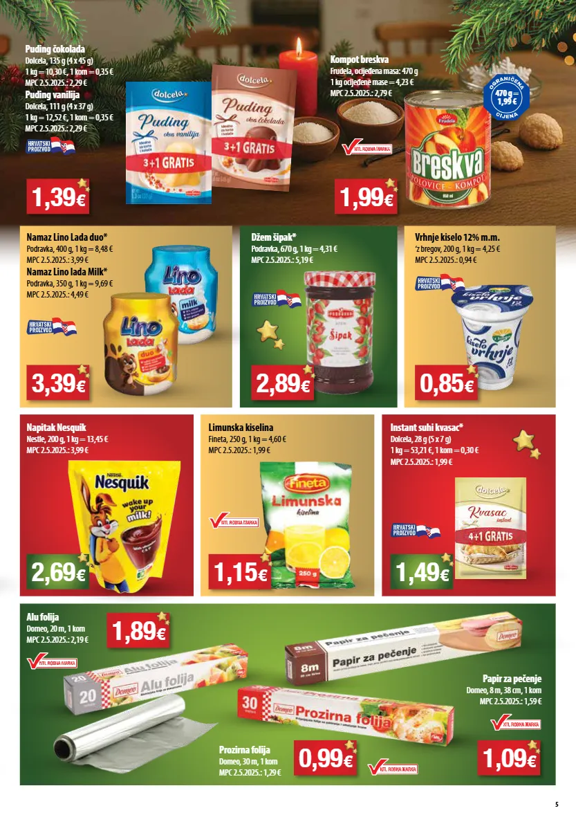 5 limunska kiselina fineta, 250 g, 1 kg = 4,60 € mpc 2.5.2025.: 1,99 € puding čokolada dolcela, 135 g (4 x 45 g) 1 kg = 10,30 €, 1 kom = 0,35 € mpc 2.5.2025.: 2,29 € puding vanilija dolcela, 111 g (4 x 37 g) 1 kg = 12,52 €, 1 kom = 0,35 € mpc 2.5.2025.: 2,29 € kompot breskva frudela, ocijeđena masa: 470 g 1 kg ocijeđene mase = 4,23 € mpc 2.5.2025.: 2,79 € alu folija domeo, 20 m, 1 kom mpc 2.5.2025.: 2,19 € prozirna folija domeo, 30 m, 1 kom mpc 2.5.2025.: 1,29 € papir za pečenje domeo, 8 m, 38 cm, 1 kom mpc 2.5.2025.: 1,59 € napitak nesquik nestle, 200 g, 1 kg = 13,45 € mpc 2.5.2025.: 3,99 € instant suhi kvasac* dolcela, 28 g (5 x 7 g) 1 kg = 53,21 €, 1 kom = 0,30 € mpc 2.5.2025.: 1,99 € namaz lino lada duo* podravka, 400 g, 1 kg = 8,48 € mpc 2.5.2025.: 3,99 € namaz lino lada milk* podravka, 350 g, 1 kg = 9,69 € mpc 2.5.2025.: 4,49 € džem šipak* podravka, 670 g, 1 kg = 4,31 € mpc 2.5.2025.: 5,19 € vrhnje kiselo 12% m.m. ‘z bregov, 200 g, 1 kg = 4,25 € mpc 2.5.2025.: 0,94 € 1,89 € 0,99 € 1,09 € 3,39 € 2,89 € 0,85 € 2,69 € 1,15 € 1,49 € 1,39 € 1,99 € 470 g = 1,99 €