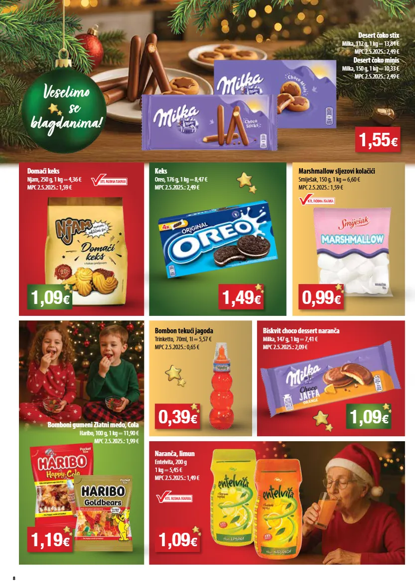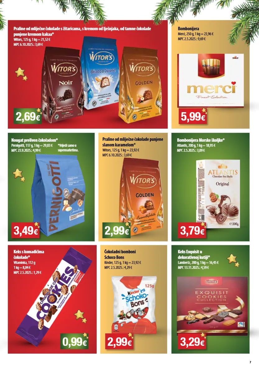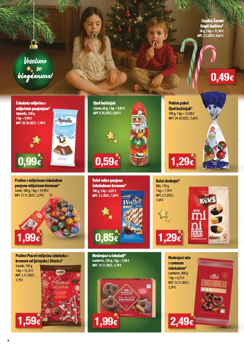 veselimo se blagdanima! 6 0,49 € praline s mliječnom čokoladom punjene mliječnom kremom* sorini, 100 g, 1 kg = 19,90 € mpc 21.11.2025.: 2,79 € poklon paket djed božićnjak* 100 g, 1 kg = 12,90 € mpc 24.10.2025.: 1,69 € lizalica šareni štapić božićna* 28 g, 1 kg = 17,50 € mpc 2.5.2025.: 0,65 € praline piaceri mliječna čokolada s kremom od lješnjaka i žitarica* socado, 130 g 1 kg = 12,23 € mpc 3.11.2025.: 2,19 € djed božićnjak cosmo, 60 g, 1 kg = 9,83 € mpc 9.10.2025.: 0,87 € medenjaci mix s tamnom čokoladom* lambertz, 400 g 1 kg = 6,23 € mpc 13.11.2025.: 3,29 € medenjaci u čokoladi* lambertz, 250 g, 1 kg = 7,96 € mpc 13.11.2025.: 2,79 € čokolada mliječna s mliječnim punjenjem* alpinella, 100 g 1 kg = 9,90 € mpc 20.10.2025.: 1,49 € vafel rolice punjene čokoladnom kremom* 140 g, 1 kg = 6,07 € mpc 2.5.2025.: 1,09 € 0,99 € 0,59 € 1,29 € 1,99 € 0,85 € 1,59 € 1,99 € 2,49 € kolač dvobojni* bifa, 170 g 1 kg = 7,59 € mpc 2.5.2025.: 1,64 € 1,29 €