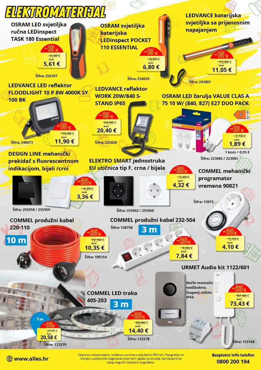 6,60 € 5,61 € kom -15 % osram svjetiljka baterijska ledinspect pocket 110 essential 8,00 € 6,80 € kom -15 % 13,00 € 11,05 € kom -15 % 14,00 € 11,90 € kom -15 % 24,00 € 20,40 € kom -15 % 2,10 € 1,89 € kom -10 % 4,20 € 3,36 € kom -20 % elektro smart jednostruka eu utičnica tip f, crna / bijela 5,40 € 4,32 € kom -20 % 5,12 € 4,10 € kom -20 % commel produžni kabel 232-504 9,80 € 7,84 € kom -20 % 3 m 97,90 € 73,43 € kom -25 % osram led svjetiljka ručna ledinspect task 180 essential besplatni info telefon 0800 200 194 www.alles.hr cijene su maloprodajne, izražene u eurima s uključenim pdv-om. fotografije ne moraju u potpunosti odgovarati stvarnom izgledu proizvoda. ispričavamo se zbog mogućih tiskarskih pogrešaka. aifra: 254039 ledvance baterijska svjetiljka sa prijenosnim napajanjem aifra: 243807 ledvance led reflektor floodlight 10 p 8w 4000k sy 100 bk aifra: 248073 ledvance reflektor work 20w/840 s- stand ip65 aifra: 225828 osram led žarulja value clas a 75 10 w/ (840, 827) e27 duo pack aifra: 223082 / 223083 aifra: 255958 / 255959 design line mehanički prekidač s fluorescentnom indikacijom, bijeli /crni aifra: 255962 / 255960 commel mehanički programator vremena 90821 aifra: 12015 commel produžni kabel 220-110 aifra: 189314 12,94 € 10,35 € kom -20 % 10 m aifra: 128758 urmet audio kit 1122/601 aifra: 151168 način montaže: nadžbukno. stupanj zabtite ip44. commel led traka 405-203 3 m 18,00 € 14,40 € kom -20 % aifra: 133278 25,73 € 20,58 € kom -20 % 5 m aifra: 133279 elektromaterijal elektromaterijal 1 kom = 0,95 € aifra: 250397