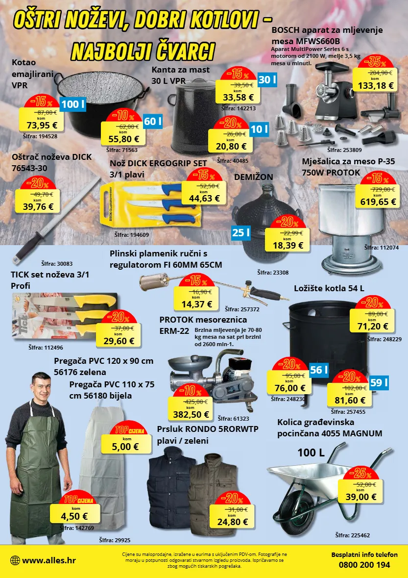 No~ DICK ERGOGRIP SET 3/1 plavi 62,00 € 55,80 € kom -10 % 60 l 87,00 € 73,95 € kom -15 % 100 l aifra: 142213 39,50 € 33,58 € kom -15 % 30 l 26,00 € 20,80 € kom -20 % 10 l 52,50 € 44,63 € kom -15 % 49,70 € 39,76 € kom -20 % 729,00 € 619,65 € kom -15 % 25 l 22,99 € 18,39 € kom -20 % 16,90 € 14,37 € kom -15 % 37,00 € 29,60 € kom -20 % 5,00 € kom TOP CIJENA 4,50 € kom TOP CIJENA Prsluk RONDO 5RORWTP plavi / zeleni 52,00 € 39,00 € kom -25 % 425,00 € 382,50 € kom -10 % 89,00 € 71,20 € kom -20 % 95,00 € 76,00 € kom -20 % 56 l 102,00 € 81,60 € kom -20 % 59 l 204,90 € 133,18 € kom -35 % aifra: 194528 TICK set no~eva 3/1 Profi Besplatni info telefon 0800 200 194 www.alles.hr Cijene su maloprodajne, izražene u eurima s uključenim PDV-om. Fotografije ne moraju u potpunosti odgovarati stvarnom izgledu proizvoda. Ispričavamo se zbog mogućih tiskarskih pogrešaka. aifra: 194609 aifra: 71563 aifra: 30083 Oštri noževi , dobri kotlovi - najbolji čvarci Oštri noževi, dobri kotlovi - najbolji čvarci Kanta za mast 30 L VPR Kotao emajlirani VPR Obtrač no~eva DICK 76543-30 aifra: 40485 Mjebalica za meso P-35 750W PROTOK aifra: 112074 DEMI}ON aifra: 23308 Plinski plamenik ručni s regulatorom FI 60MM 65CM aifra: 257372 aifra: 112496 aifra: 29925 Pregača PVC 110 x 75 cm 56180 bijela Pregača PVC 120 x 90 cm 56176 zelena aifra: 142769 Kolica građevinska pocinčana 4055 MAGNUM aifra: 225462 100 L PROTOK mesoreznica ERM-22 aifra: 61323 Brzina mljevenja je 70-80 kg mesa na sat pri brzini od 2600 min-1. Lo~ibte kotla 54 L aifra: 248229 aifra: 248230 aifra: 257455 aifra: 253809 BOSCH aparat za mljevenje mesa MFWS660B Aparat MultiPower Series 6 s motorom od 2100 W, melje 3,5 kg mesa u minuti. 31,00 € 24,80 € kom -20 %
