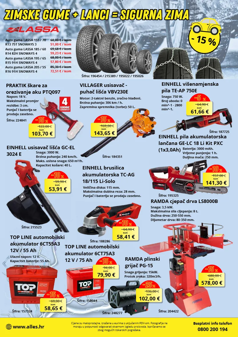 680,00 € 578,00 € kom -15 % top line automobilski akumulator 6ct75a3 12 v / 75 ah einhell pila akumulatorska lančana ge-lc 18 li kit pxc (1x3,0ah) 64,90 € 58,41 € kom -10 % 69,00 € 58,65 € kom -15 % 94,00 € 79,90 € kom -15 % napon: 18 v. maksimalni promjer rezidbe: 3 cm. punjač i baterija se prodaju zasebno. 122,00 € 103,70 € kom -15 % 59,90 € 53,91 € kom -10 % einhell brusilica akumulatorska tc-ag 18/115 li-solo einhell usisavač libća gc-el 3024 e snaga: 3000 w. brzina puhanja: 240 km/h. maks. usisna snaga: 650 m³/h. kapacitet kobare: 40 l. 169,00 € 143,65 € kom -15 % aifra: 204422 64,90 € 61,66 € kom -5 % 136,00 € 102,00 € kom -25 % 157,00 € 141,30 € kom -10 % zimske gume + lanci = sigurna zima zimske gume + lanci = sigurna zima - 15 % besplatni info telefon 0800 200 194 www.alles.hr cijene su maloprodajne, izražene u eurima s uključenim pdv-om. fotografije ne moraju u potpunosti odgovarati stvarnom izgledu proizvoda. ispričavamo se zbog mogućih tiskarskih pogrešaka. ramda cjepač drva ls8000b snaga: 3,5 kw. maksimalna sila cijepanja: 8 t. dužina drva: 250-550 mm. dijametar drva: 80-350 mm. veličina diska: 115 mm. maksimalna dubina reza: 28 mm. punjač i baterija se prodaju zasebno. aifra: 188286 top line automobilski akumulator 6ct55a3 12v / 55 ah ulazni napon: 12 v. kapacitet baterije: 55 ah. aifra: 157324 aifra: 158044 aifra: 195325 baterija: 3000 mah. vrijeme punjenja: 1 h. duljina mača: 250 mm. praktik bkare za orezivanje aku ptq097 aifra: 224841 aifra: 215523 aifra: 196454 / 215389 / 195022 / 195026 auto guma lassa 155 / 70 r13 75t snoways 3 auto guma lassa 185 / 60 r14 82h snoways 4 auto guma lassa 195 / 65 r15 91h snoways 4 auto guma lassa 205 / 55 r16 91h snoways 4 60,00 € / kom 69,68 € / kom 68,00 € / kom 85,30 € / kom villager usisavač - puhač libća vbv230e aifra: 184351 motor: 2-taktni benzin, zračno hlađeni. brzina puhanja: 306 km / h. zapremina spremnika (torbe): 50 l. einhell vibenamjenska pila te-ap 750e snaga: 750 w. broj uboda: 0 min^-1 - 2800 min^-1. aifra: 187725 ramda plinski grijač pg-15 aifra: 248277 snaga grijanja: 15kw. protok zraka: 320m3/h. 51,00 € / kom 59,23 € / kom 57,80 € / kom 72,51 € / kom
