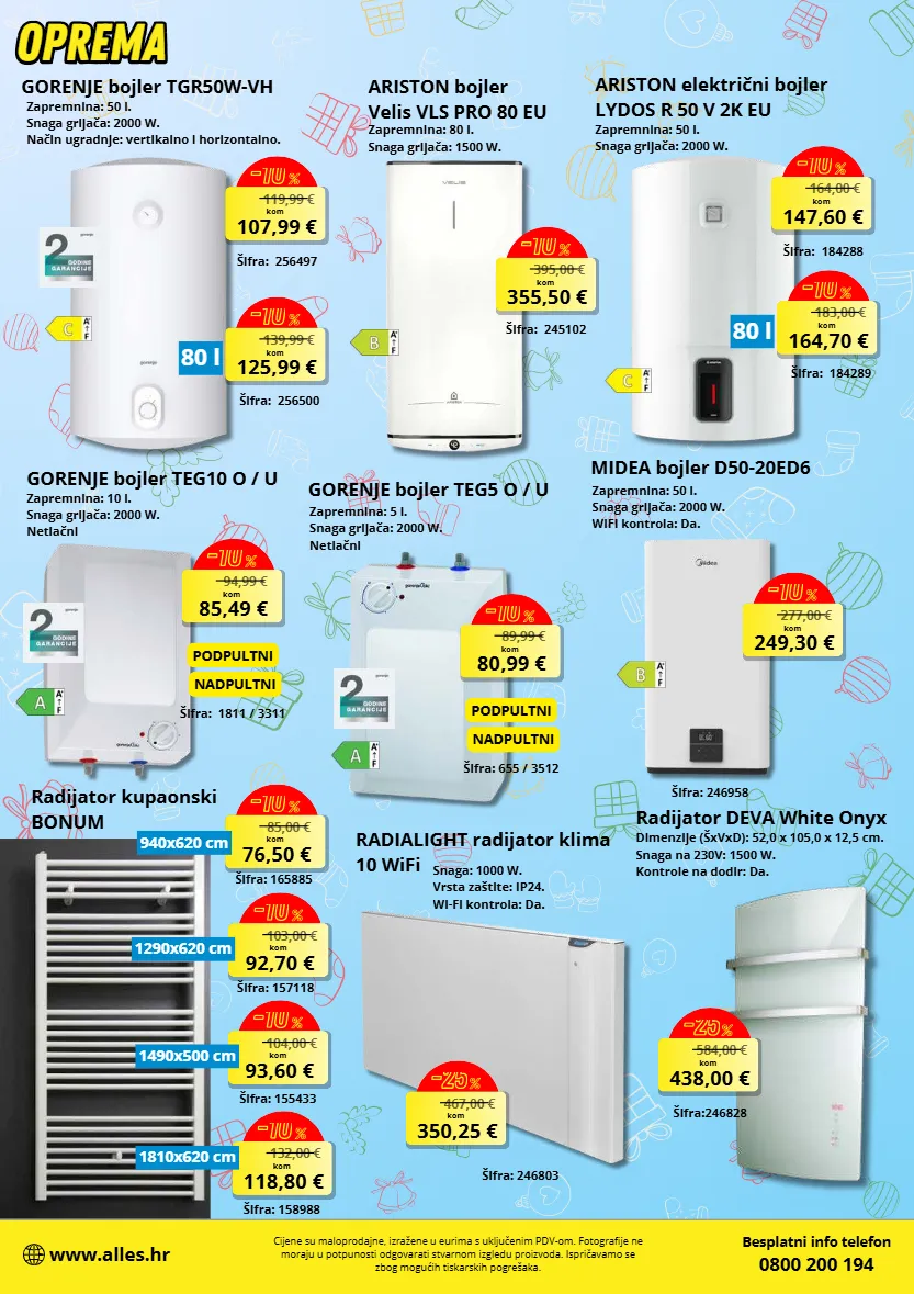 139,99 € 125,99 € kom -10 % 80 l 119,99 € 107,99 € kom -10 % 395,00 € 355,50 € kom -10 % 183,00 € 164,70 € kom -10 % 80 l 164,00 € 147,60 € kom -10 % 94,99 € 85,49 € kom -10 % 89,99 € 80,99 € kom -10 % 584,00 € 438,00 € kom -25 % 277,00 € 249,30 € kom -10 % 467,00 € 350,25 € kom -25 % radijator kupaonski bonum 85,00 € 76,50 € kom -10 % 940x620 cm 103,00 € 92,70 € kom -10 % 1290x620 cm 104,00 € 93,60 € kom -10 % 1490x500 cm 132,00 € 118,80 € kom -10 % 1810x620 cm besplatni info telefon 0800 200 194 www.alles.hr cijene su maloprodajne, izražene u eurima s uključenim pdv-om. fotografije ne moraju u potpunosti odgovarati stvarnom izgledu proizvoda. ispričavamo se zbog mogućih tiskarskih pogrešaka. gorenje bojler tgr50w-vh aifra: 256497 zapremnina: 50 l. snaga grijača: 2000 w. način ugradnje: vertikalno i horizontalno. aifra: 256500 ariston bojler velis vls pro 80 eu zapremnina: 80 l. snaga grijača: 1500 w. aifra: 245102 ariston električni bojler lydos r 50 v 2k eu aifra: 184289 aifra: 184288 zapremnina: 50 l. snaga grijača: 2000 w. aifra: 1811 / 3311 nadpultni podpultni gorenje bojler teg10 o / u zapremnina: 10 l. snaga grijača: 2000 w. netlačni gorenje bojler teg5 o / u zapremnina: 5 l. snaga grijača: 2000 w. netlačni aifra: 655 / 3512 nadpultni podpultni radijator deva white onyx aifra:246828 dimenzije (axvxd): 52,0 x 105,0 x 12,5 cm. snaga na 230v: 1500 w. kontrole na dodir: da. midea bojler d50-20ed6 zapremnina: 50 l. snaga grijača: 2000 w. wifi kontrola: da. aifra: 246958 aifra: 246803 radialight radijator klima 10 wifi snaga: 1000 w. vrsta zabtite: ip24. wi-fi kontrola: da. aifra: 165885 aifra: 157118 aifra: 155433 aifra: 158988 oprema oprema