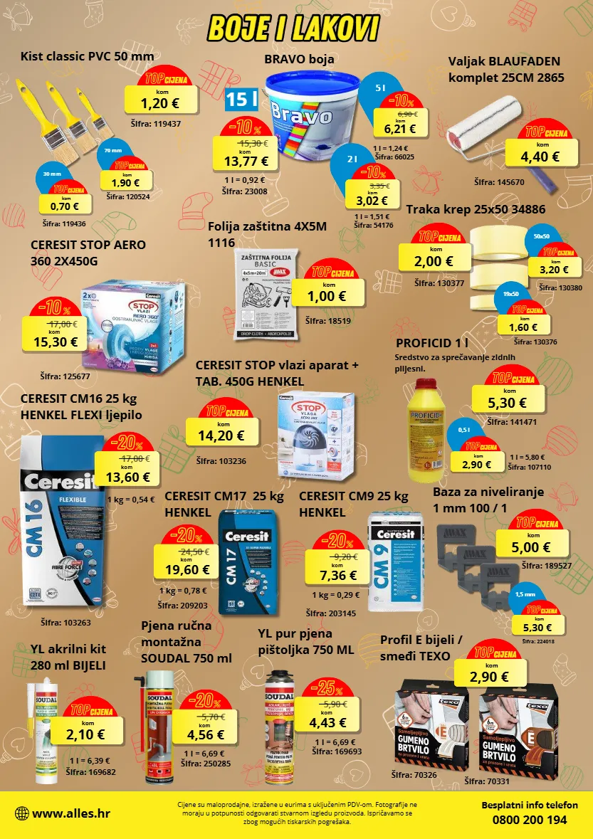 kist classic pvc 50 mm aifra: 119436 30 mm 0,70 € kom top cijena 70 mm 1,90 € kom top cijena 1,20 € kom top cijena 1,00 € kom top cijena 15 l 15,30 € 13,77 € kom -10 % 6,90 € 6,21 € kom -10 % 5 l 3,35 € 3,02 € kom -10 % 2 l aifra: 54176 2,00 € kom top cijena aifra: 130377 50x50 3,20 € kom top cijena 19x50 1,60 € kom top cijena 5,70 € 4,56 € kom -20 % 2,10 € kom top cijena 4,40 € kom top cijena sredstvo za sprečavanje zidnih plijesni. 5,30 € kom top cijena 0,5 l 2,90 € kom top cijena 14,20 € kom top cijena 5,90 € 4,43 € kom -25 % profil e bijeli / smeđi texo 2,90 € kom top cijena baza za niveliranje 1 mm 100 / 1 17,00 € 13,60 € kom -20 % besplatni info telefon 0800 200 194 www.alles.hr cijene su maloprodajne, izražene u eurima s uključenim pdv-om. fotografije ne moraju u potpunosti odgovarati stvarnom izgledu proizvoda. ispričavamo se zbog mogućih tiskarskih pogrešaka. boje i lakovi boje i lakovi aifra: 119437 aifra: 120524 folija zabtitna 4x5m 1116 aifra: 18519 aifra: 23008 1 l = 0,92 € 1 l = 1,24 € aifra: 66025 1 l = 1,51 € bravo boja traka krep 25x50 34886 aifra: 130380 aifra: 130376 yl akrilni kit 280 ml bijeli aifra: 169682 1 l = 6,39 € pjena ručna montažna soudal 750 ml aifra: 250285 1 l = 6,69 € valjak blaufaden komplet 25cm 2865 aifra: 145670 aifra: 141471 proficid 1 l aifra: 107110 1 l = 5,80 € ceresit stop vlazi aparat + tab. 450g henkel aifra: 103236 ceresit stop aero 360 2x450g aifra: 125677 yl pur pjena pibtoljka 750 ml aifra: 169693 1 l = 6,69 € aifra: 70326 aifra: 70331 aifra: 189527 ceresit cm16 25 kg henkel flexi ljepilo aifra: 103263 ceresit cm17 25 kg henkel aifra: 209203 aifra: 203145 ceresit cm9 25 kg henkel 24,50 € 19,60 € kom -20 % 9,20 € 7,36 € kom -20 % 5,00 € kom top cijena 1,5 mm 5,30 € kom top cijena aifra: 224018 1 kg = 0,54 € 1 kg = 0,78 € 1 kg = 0,29 € 17,00 € 15,30 € kom -10 %