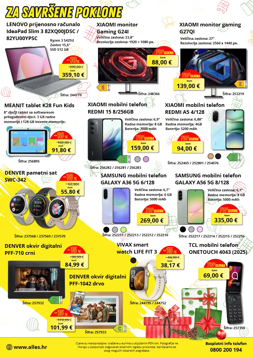 399,00 € 359,10 € kom -10 % 88,00 € kom top cijena 139,00 € kom top cijena 335,00 € kom top cijena 269,00 € kom top cijena 94,00 € kom top cijena 159,00 € kom top cijena 102,00 € 91,80 € kom -10 % denver pametni sat swc-342 62,00€ 55,80 € kom -10 % denver okvir digitalni pff-710 crni 99,99 € 84,99 € kom -15 % 119,99 € 101,99 € kom -15 % vivax smart watch life fit 3 šifra: 244795 / 244752 denver okvir digitalni pff-1042 drvo 69,00 € kom top cijena 44,90 € 38,17 € kom -15 % besplatni info telefon 0800 200 194 www.alles.hr cijene su maloprodajne, izražene u eurima s uključenim pdv-om. fotografije ne moraju u potpunosti odgovarati stvarnom izgledu proizvoda. ispričavamo se zbog mogućih tiskarskih pogrešaka. lenovo prijenosno računalo ideapad slim 3 82xq00jdsc / 82yu00ypsc šifra: 244779 ryzen 3 5425u zaslon 15,6" ssd 512 gb xiaomi monitor gaming g24i veličina zaslona: 23,8" rezolucija zaslona: 1920 × 1080 px. šifra: 248366 šifra: 253219 xiaomi monitor gaming g27qi veličina zaslona: 27" rezolucija zaslona: 2560 x 1440 px. samsung mobilni telefon galaxy a56 5g 8/128 šifra: 252217 / 252214 / 252215 / 252216 veličina zaslona: 6,7" radna memorija: 8 gb baterija: 5000 mah samsung mobilni telefon galaxy a36 5g 6/128 šifra: 252211 / 252213 / 252212 / 252210 veličina zaslona: 6,7" radna memorija: 6 gb baterija: 5000 mah xiaomi mobilni telefon redmi a5 4/128 veličina zaslona: 6,88" radna memorija: 4gb baterija: 5200 mah šifra: 252465 / 252801 / 254076 xiaomi mobilni telefon redmi 15 8/256gb veličina zaslona: 6,9" radna memorija: 8 gb baterija: 7000 mah šifra: 256282 / 256281 / 256283 tcl mobilni telefon onetouch 4043 (2025) šifra: 257350 meanit tablet k28 fun kids 8" dječji tablet sa softwareom prilagođenim djeci. 3 gb radne memorije i 128 gb interne memorije. šifra: 256895 šifra: 237568 / 237569 / 237570 šifra: 257932 šifra: 257933 za savršene poklone za savršene poklone