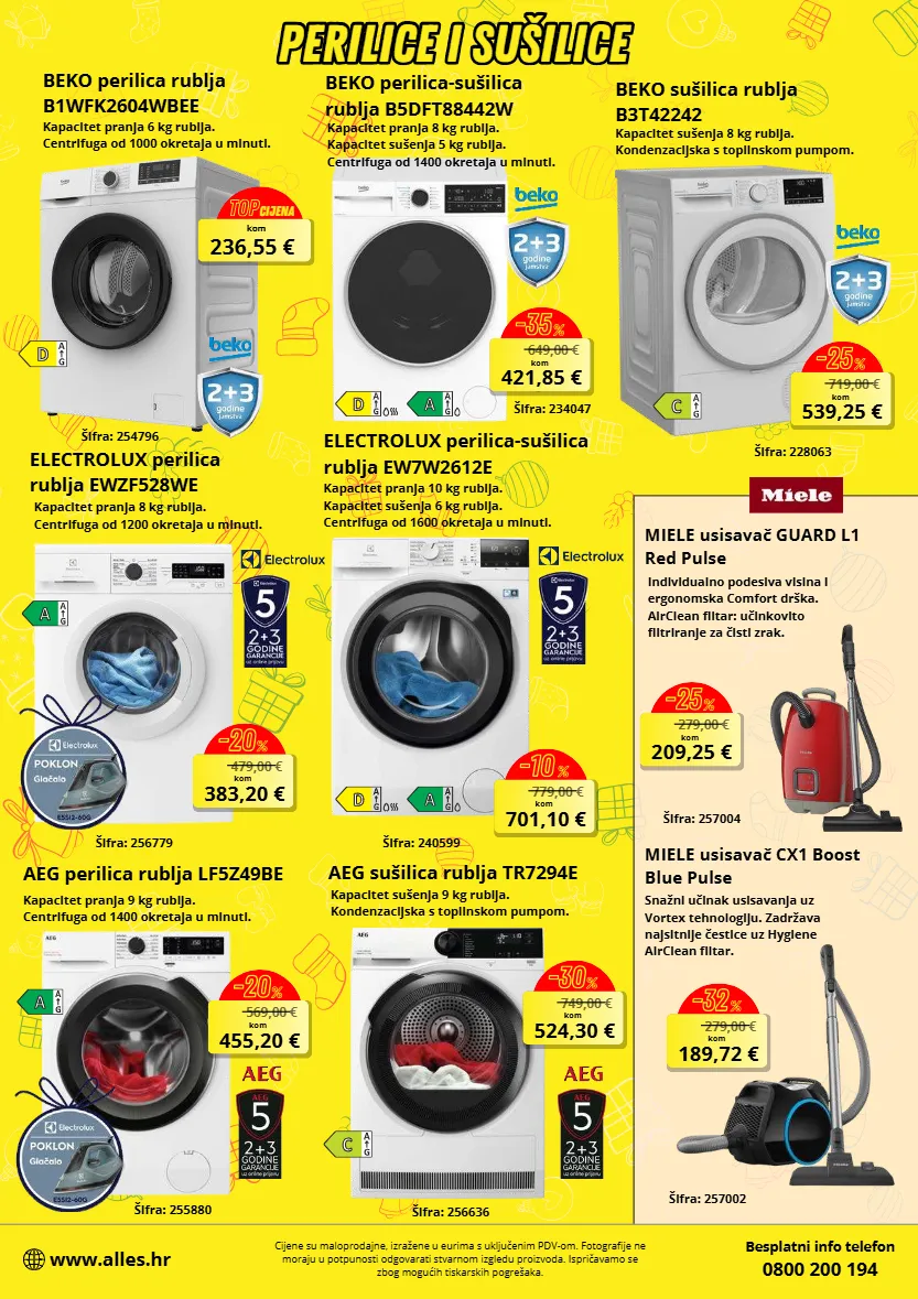 649,00 € 421,85 € kom -35 % 719,00 € 539,25 € kom -25 % 749,00 € 524,30 € kom -30 % 569,00 € 455,20 € kom -20 % 479,00 € 383,20 € kom -20 % 779,00 € 701,10 € kom -10 % 279,00 € 209,25 € kom -25 % 279,00 € 189,72 € kom -32 % aifra: 255880 besplatni info telefon 0800 200 194 www.alles.hr cijene su maloprodajne, izražene u eurima s uključenim pdv-om. fotografije ne moraju u potpunosti odgovarati stvarnom izgledu proizvoda. ispričavamo se zbog mogućih tiskarskih pogrešaka. beko perilica-subilica rublja b5dft88442w beko perilica rublja b1wfk2604wbee aifra: 234047 kapacitet pranja 6 kg rublja. centrifuga od 1000 okretaja u minuti. kapacitet pranja 8 kg rublja. kapacitet subenja 5 kg rublja. centrifuga od 1400 okretaja u minuti. aifra: 254796 beko subilica rublja b3t42242 aifra: 228063 kapacitet subenja 8 kg rublja. kondenzacijska s toplinskom pumpom. aeg subilica rublja tr7294e aifra: 256636 kapacitet subenja 9 kg rublja. kondenzacijska s toplinskom pumpom. aeg perilica rublja lf5z49be kapacitet pranja 9 kg rublja. centrifuga od 1400 okretaja u minuti. aifra: 256779 electrolux perilica rublja ewzf528we kapacitet pranja 8 kg rublja. centrifuga od 1200 okretaja u minuti. electrolux perilica-subilica rublja ew7w2612e kapacitet pranja 10 kg rublja. kapacitet subenja 6 kg rublja. centrifuga od 1600 okretaja u minuti. aifra: 240599 miele usisavač guard l1 red pulse miele usisavač cx1 boost blue pulse individualno podesiva visina i ergonomska comfort drbka. airclean filtar: učinkovito filtriranje za čisti zrak. snažni učinak usisavanja uz vortex tehnologiju. zadržava najsitnije čestice uz hygiene airclean filtar. aifra: 257002 aifra: 257004 perilice i sušilice perilice i sušilice 236,55 € kom top cijena