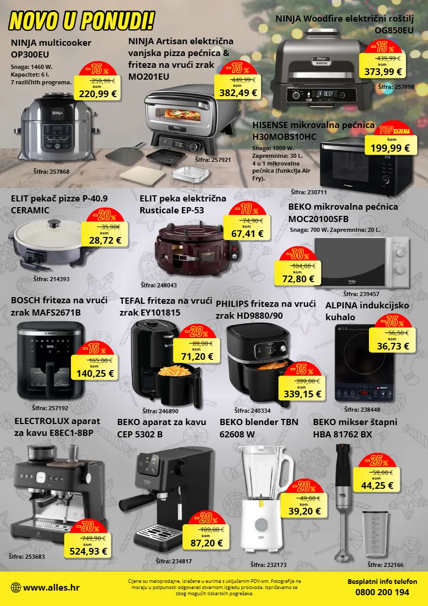 199,99 € kom top cijena 259,99 € 220,99 € kom -15 % ninja woodfire električni robtilj og850eu 439,99 € 373,99 € kom -15 % 449,99 € 382,49 € kom -15 % 104,00 € 72,80 € kom -30 % elit pekač pizze p-40.9 ceramic 35,90€ 28,72 € kom -20 % 74,90 € 67,41 € kom -10 % 749,90 € 524,93 € kom -30 % 109,00 € 87,20 € kom -20 % 165,00 € 140,25 € kom -15 % 89,00 € 71,20 € kom -20 % 399,00 € 339,15 € kom -15 % 59,00 € 44,25 € kom -25 % 49,00 € 39,20 € kom -20 % 56,50 € 36,73 € kom -35 % snaga: 700 w. zapremnina: 20 l. besplatni info telefon 0800 200 194 www.alles.hr cijene su maloprodajne, izražene u eurima s uključenim pdv-om. fotografije ne moraju u potpunosti odgovarati stvarnom izgledu proizvoda. ispričavamo se zbog mogućih tiskarskih pogrešaka. novo u ponudi ! novo u ponudi! hisense mikrovalna pećnica h30mobs10hc aifra: 230711 snaga: 1000 w. zapremnina: 30 l. 4 u 1 mikrovalna pećnica (funkcija air fry). snaga: 1460 w. kapacitet: 6 l. 7 različitih programa. ninja multicooker op300eu aifra: 257868 aifra: 257898 aifra: 257921 ninja artisan električna vanjska pizza pećnica & friteza na vrući zrak mo201eu beko mikrovalna pećnica moc20100sfb aifra: 239457 elit peka električna rusticale ep-53 aifra: 248043 aifra: 214393 beko aparat za kavu cep 5302 b aifra: 234817 electrolux aparat za kavu e8ec1-8bp aifra: 253683 bosch friteza na vrući zrak mafs2671b aifra: 257192 tefal friteza na vrući zrak ey101815 aifra: 246890 aifra: 240334 philips friteza na vrući zrak hd9880/90 alpina indukcijsko kuhalo aifra: 238448 beko mikser btapni hba 81762 bx aifra: 232166 beko blender tbn 62608 w aifra: 232173