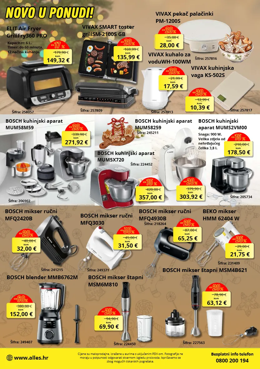179,90 € 149,32 € kom -17 % bosch kuhinjski aparat mum58m59 339,90 € 271,92 € kom -20 % 379,90 € 303,92 € kom -20 % 210,00 € 178,50 € kom -15 % 420,00 € 357,00 € kom -15 % 40,00 € 32,00 € kom -20 % bosch mikser ručni mfq3030 45,00 € 31,50 € kom -30 % bosch mikser ručni mfq4930b 87,00 € 65,25 € kom -25 % 380,00 € 152,00 € kom -60 % 78,90 € 63,12 € kom -20 % 94,90 € 69,90 € kom -25 % 35,00 € 28,00 € kom -20 % 12,99 € 10,39 € kom -20 % 169,99 € 135,99 € kom -20 % 21,99 € 17,59 € kom -20 % besplatni info telefon 0800 200 194 www.alles.hr cijene su maloprodajne, izražene u eurima s uključenim pdv-om. fotografije ne moraju u potpunosti odgovarati stvarnom izgledu proizvoda. ispričavamo se zbog mogućih tiskarskih pogrešaka. elit air fryer grillfry360 pro aifra: 258057 kapacitet: 6 l. timer: do 60 minuta. 12 načina kuhanja. aifra: 245211 bosch kuhinjski aparat mums2vm00 aifra: 205734 snaga: 900 w. velika zdjela od nehrđajućeg čelika 3,8 l. bosch kuhinjski aparat mum58259 aifra: 206902 aifra: 224452 bosch kuhinjski aparat mum5x720 bosch mikser ručni mfq2420b aifra: 241215 aifra: 249371 aifra: 218264 bosch blender mmb6762m aifra: 249407 bosch mikser btapni msm4b621 aifra: 227563 bosch mikser btapni msm6m810 aifra: 224450 vivax pekač palačinki pm-1200s aifra: 257816 vivax kuhinjska vaga ks-502s aifra: 257817 vivax smart toster grillsm-2100s gb aifra: 257809 vivax kuhalo za voduwh-100wm aifra: 257813 novo u ponudi ! novo u ponudi! 29,00 € 21,75 € kom -25 % beko mikser hmm 62404 w aifra: 231409