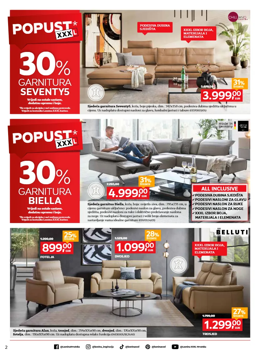 2 @lesnina xxxl hrvatska @lesninahrvatska @lesninaxxxl @lesninaxxxl @lesnina_inspiracija koza 4.999, 00 eur 31 % štedite 7.293,00 899, 00 eur 25 % štedite 1.200,00 fotelja 1.099, 00 eur 28 % štedite 1.529,00 dvosjed 1.299, 00 eur 27 % štedite 1.799,00 trosjed 3.999, 00 eur 31 % štedite 5.876,50 xxxl izbor boja, materijala i elemenata podesiva dubina sjedišta xxxl izbor boja, materijala i elemenata popust * 30 % garnitura seventy5 *ne vrijedi za akcijske i već snižene proizvode. vrijedi za korisnike lesnina xxxl kartice. vrijedi na ostale sastave, dodatnu opremu i boje. popust * 30 % garnitura biella *ne vrijedi za akcijske i već snižene proizvode. vrijedi za korisnike lesnina xxxl kartice. vrijedi na ostale sastave, dodatnu opremu i boje. sjedeća garnitura seventy5 , koža, boje pijeska, dim.: 342x158 cm, podesiva dubina sjedišta uključena u cijenu. uz nadoplatu dostupni nasloni za glavu, lumbalni jastuci i tabure (01370003/05) sjedeća garnitua biella , koža, boja: svijetlo siva, dim.: 295x231 cm, u cijenu garniture uključeno: podesivi naslon za glavu, podesiva dubina sjedišta, podesivi nasloni za ruke i električno podešavanje naslona za noge. uz nadoplatu dostupni jastuci i velik broje elemenata za sastavljanje vama idealne garniture (02970554/01) sjedeća garnitura alan , koža, trosjed , dim.: 214x105x98 cm, dvosjed , dim.: 176x105x98 cm, fotelja , dim.: 116x105x98 cm. uz nadoplatu dostupna relaks funkcija (09130001/18,29,40) p podesiva dubina sjedišta p podesivi nasloni za glavu p podesivi naslon za ruke p podesivi naslon za noge p xxxl izbor boja, materijala i elemenata all inclusive