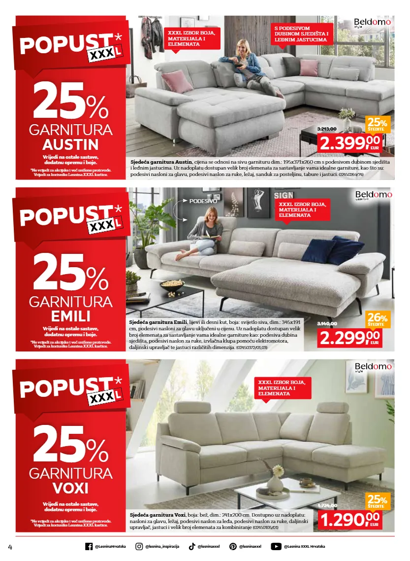 4 @lesnina xxxl hrvatska @lesninahrvatska @lesninaxxxl @lesninaxxxl @lesnina_inspiracija 3.213,00 2.399, 00 eur 25 % štedite 2.299, 00 eur 26 % štedite 3.140,00 1.290, 00 eur 25 % štedite 1.724,00 s podesivom dubinom sjedišta i leđnim jastucima xxxl izbor boja, materijala i elemenata xxxl izbor boja, materijala i elemenata xxxl izbor boja, materijala i elemenata popust * 25 % garnitura austin *ne vrijedi za akcijske i već snižene proizvode. vrijedi za korisnike lesnina xxxl kartice. vrijedi na ostale sastave, dodatnu opremu i boje. popust * 25 % garnitura emili *ne vrijedi za akcijske i već snižene proizvode. vrijedi za korisnike lesnina xxxl kartice. vrijedi na ostale sastave, dodatnu opremu i boje. popust * 25 % garnitura voxi *ne vrijedi za akcijske i već snižene proizvode. vrijedi za korisnike lesnina xxxl kartice. vrijedi na ostale sastave, dodatnu opremu i boje. sjedeća garnitura austin , cijena se odnosi na sivu garnituru dim.: 195x371x260 cm s podesivom dubinom sjedišta i leđnim jastucima. uz nadoplatu dostupan velik broj elemenata za sastavljanje vama idealne garniture, kao što su: podesivi nasloni za glavu, podesivi naslon za ruke, ležaj, sanduk za posteljinu, tabure i jastuci. 02450269/74) sjedeća garnitura emili , lijevi ili desni kut, boja: svijetlo siva, dim.: 345x191 cm, podesivi nasloni za glavu uključeni u cijenu. uz nadoplatu dostupan velik broj elemenata za sastavljanje vama idealne garniture kao: podesiva dubina sjedišta, podesivi naslon za ruke, izvlačna klupa pomoću elektromotora, daljinski upravljač te jastuci različitih dimenzija. (02450372/01,03) sjedeća garnitura voxi , boja: bež, dim.: 241x200 cm. dostupno uz nadoplatu: nasloni za glavu, ležaj, podesivi naslon za leđa, podesivi naslon za ruke, daljinski upravljač, jastuci i velik broj elemenata za kombiniranje (02450105/01) podesivo