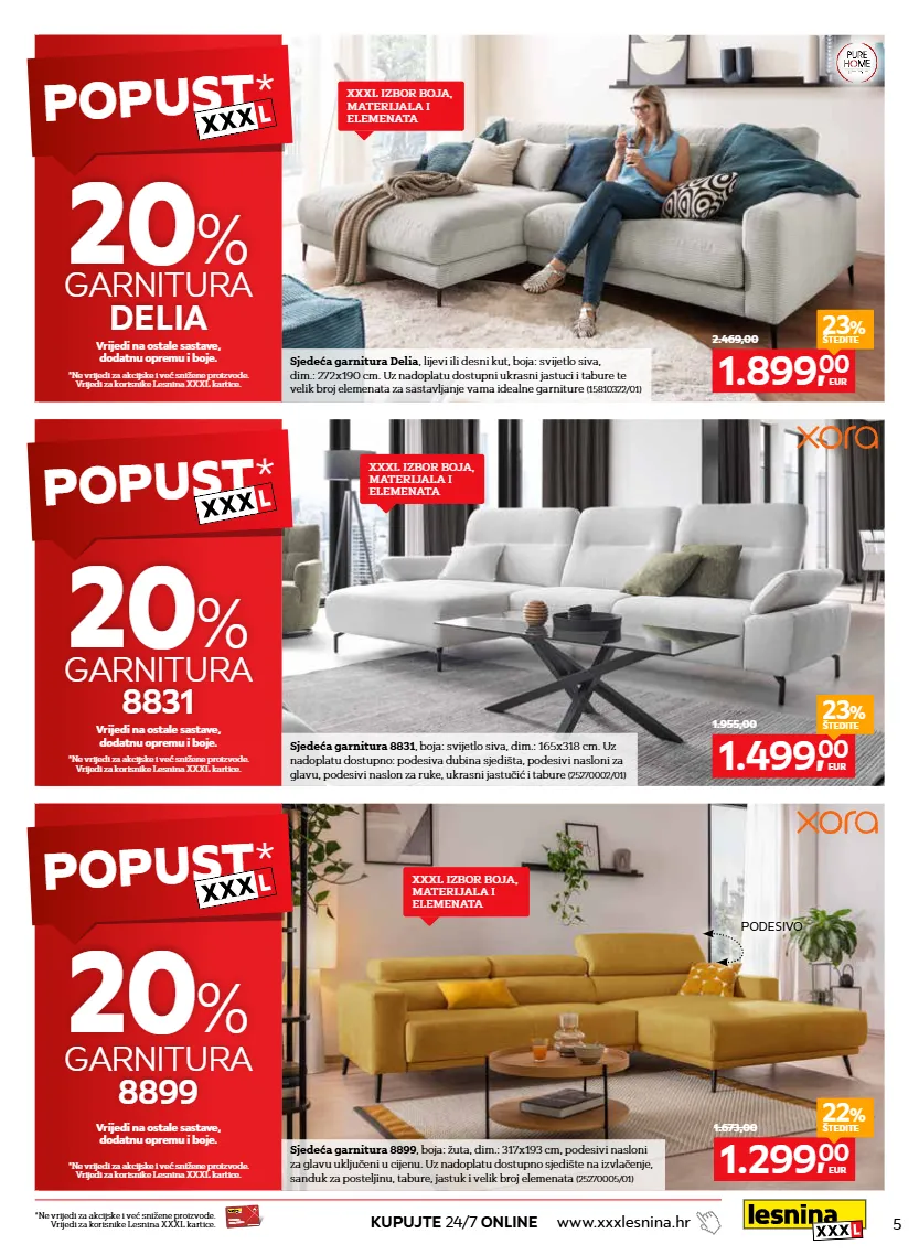 5 kupujte 24/7 online www.xxxlesnina.hr *ne vrijedi za akcijske i već snižene proizvode. vrijedi za korisnike lesnina xxxl kartice. www.xxxlesnina.hr lesnina xxxl card 1.299, 00 eur 22 % štedite 1.673,00 1.499, 00 eur 23 % štedite 1.955,00 1.899, 00 eur 23 % štedite 2.469,00 xxxl izbor boja, materijala i elemenata xxxl izbor boja, materijala i elemenata xxxl izbor boja, materijala i elemenata popust * 20 % garnitura 8899 *ne vrijedi za akcijske i već snižene proizvode. vrijedi za korisnike lesnina xxxl kartice. vrijedi na ostale sastave, dodatnu opremu i boje. popust * 20 % garnitura 8831 *ne vrijedi za akcijske i već snižene proizvode. vrijedi za korisnike lesnina xxxl kartice. vrijedi na ostale sastave, dodatnu opremu i boje. popust * 20 % garnitura delia *ne vrijedi za akcijske i već snižene proizvode. vrijedi za korisnike lesnina xxxl kartice. vrijedi na ostale sastave, dodatnu opremu i boje. sjedeća garnitura 8899 , boja: žuta, dim.: 317x193 cm, podesivi nasloni za glavu uključeni u cijenu. uz nadoplatu dostupno sjedište na izvlačenje, sanduk za posteljinu, tabure, jastuk i velik broj elemenata (25270005/01) sjedeća garnitura 8831 , boja: svijetlo siva, dim.: 165x318 cm. uz nadoplatu dostupno: podesiva dubina sjedišta, podesivi nasloni za glavu, podesivi naslon za ruke, ukrasni jastučić i tabure (25270002/01) sjedeća garnitura delia , lijevi ili desni kut, boja: svijetlo siva, dim.: 272x190 cm. uz nadoplatu dostupni ukrasni jastuci i tabure te velik broj elemenata za sastavljanje vama idealne garniture (15810322/01) podesivo