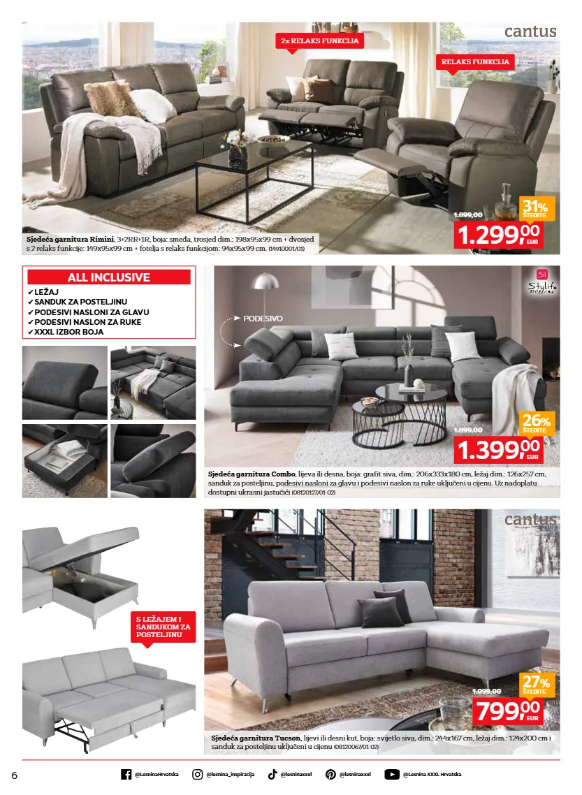 6 @lesnina xxxl hrvatska @lesninahrvatska @lesninaxxxl @lesninaxxxl @lesnina_inspiracija s ležajem i sandukom za posteljinu 2x relaks funkcija relaks funkcija 1.299, 00 eur 31 % štedite 1.899,00 1.399, 00 eur 26 % štedite 1.899,00 799, 00 eur 27 % štedite 1.099,00 podesivo sjedeća garnitura combo , lijeva ili desna, boja: grafit siva, dim.: 206x333x180 cm, ležaj dim.: 126x257 cm, sanduk za posteljinu, podesivi nasloni za glavu i podesivi naslon za ruke uključeni u cijenu. uz nadoplatu dostupni ukrasni jastučići (08120127/01-02) sjedeća garnitura tucson , lijevi ili desni kut, boja: svijetlo siva, dim.: 244x167 cm, ležaj dim.: 124x200 cm i sanduk za posteljinu uključeni u cijenu (08120067/01-02) sjedeća garnitura rimini , 3+2rr+1r, boja: smeđa, trosjed dim.: 198x95x99 cm + dvosjed s 2 relaks funkcije: 149x95x99 cm + fotelja s relaks funkcijom: 94x95x99 cm. (14910001/01) p ležaj p sanduk za posteljinu p podesivi nasloni za glavu p podesivi naslon za ruke p xxxl izbor boja all inclusive