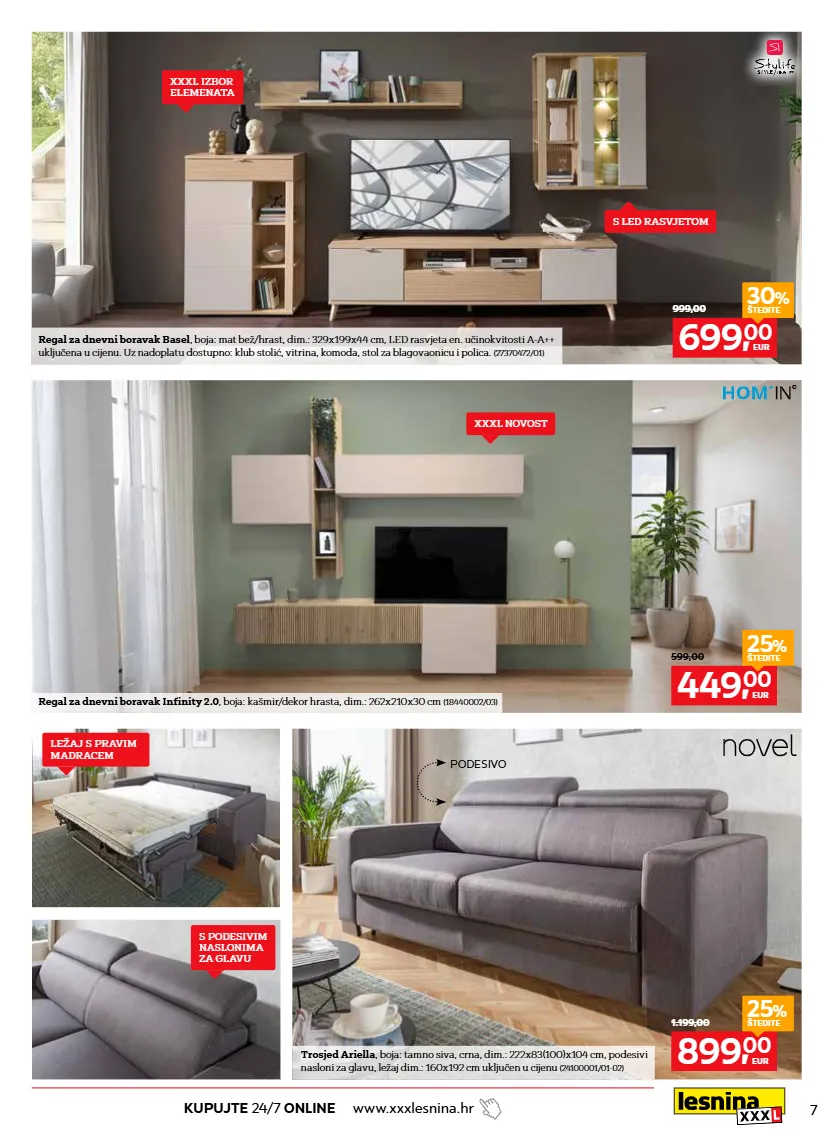 lhr12-5-c aktualna radna vremena provjerite na www.xxxlesnina.hr cijene su izražene u eurima, maloprodajne ili najniže u prethodnih 30 dana i vrijede za sve vrste plaćanja od 1. 12. do 24. 12. 2025. , odnosno do isteka zaliha u navedenom terminu. akcije nije moguće zbrajati niti spajati s akcijama na drugim odjelima koje su u tijeku. u slučaju tiskarske pogreške važeći su opis i cijena proizvoda istaknuti na prodajnom mjestu. molimo cijenjene kupce da prilikom kupovine cijene proizvoda obavezno provjere na našem web-u ili u prodajnim centrima lesnine xxxl. ne preuzimamo odgovornost za moguće tiskarske greške i razlike u boji. neke fotografije proizvoda u katalogu su simbolične. dekorativni materijal i tehnički aparati nisu uključeni u cijenu proizvoda. proizvodi označeni kao “trajno niska cijena” neće mijenjati cijenu do 31. 12. 2025. popusti vrijede uz lesnina xxxl karticu. *ako u drugoj trgovini u hrvatskoj pronađete bilo koji proizvod iz našeg prodajnog programa po nižoj cijeni, isti ćemo vam ponuditi po istoj cijeni uz 5 % dodatnog popusta prodajni centar zagreb west dušana vukotića 7 prodajni centar zagreb east slavonska avenija 106 prodajni centar split sv. leopolda mandića 2 prodajni centar pula šijanska cesta 60 prodajni centar varaždin gospodarska 37 prodajni centar zadar murvica jug 16 prodajni centar rijeka kukuljanovo 345 prodajni centar čakovec globetka b.b. prodajni centar osijek industrijska zona -jablanova 19 www.xxxlesnina.hr skenirajte qr kod i pregledajte naše kataloge. • k u p u j t e 2 4 / 7 • x x x l e s n i n a . h r set pomoćnih stolića liam , prozirno ili tonirano staklo, noge masivno drvo hrasta, dim.: ø 50x45 cm, ø 40x40 cm, nosivost do 15 kg (19090003/01,03) relaks fotelja azra , boja: siva, relaks i masažna funkcija u 4 točke uključena u cijenu, dim.: 75x108- 75x95-165 cm, nosivost do 140 kg (23810319/01) trosjed sara , boja: petrol siva, tamno siva, dim.: 195x90x94 cm, ležaj dim.: 137x195 cm (03710010/01-02) sjedeća garnitura tea , lijevi ili desni kut, boja: bijela/siva, crna/siva, dim.: 240x150 cm, ležaj dim.: 135x195 cm i sanduk za posteljinu uključeni u cijenu (10530013/11,25-26,29-30,33) regal za dnevni boravak gatwick , boja: artisan hrast/krem, dim.: 280x180x38 cm, led rasvjeta en. učinkovitosti a-a++ uključena u cijenu (08870179/01) sjedeća garnitura dana , lijevi ili desni kut, dim.: 270x175 cm, ležaj dim.: 124x216 cm i sanduk za posteljinu uključeni u cijenu (03710006/01) regal za dnevni boravak shot , mdf, boja: bijela/bijela visoki sjaj, dim.: 230x190x40 cm (11070120/01) 499, 00 eur 28 % štedite 699,00 299, 00 eur 25 % štedite 399,00 269,00 199, 00 eur 26 % štedite 399, 00 eur 33 % štedite 599,00 399, 00 eur 20 % štedite 499,00 199, 00 eur 26 % štedite 269,00 69, 00 eur 30 % štedite 99,00 s ležajem i sandukom za posteljinu led rasvjeta s ležajem i sandukom za posteljinu s ležajem i sandukom relaks i masažna funkcija visoki sjaj