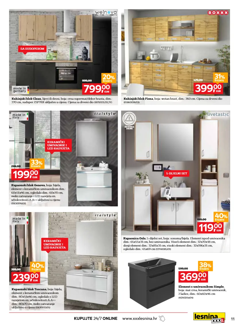 11 kupujte 24/7 online www.xxxlesnina.hr element s umivaonikom simple , boja: mat crna, keramički umivaonik, 2 ladice, dim.: 60x60x46 cm (41243209/04) 799, 00 eur 20 % štedite 999,00 369, 00 eur 38 % štedite 599,00 119, 00 eur 40 % štedite 199,00 239, 00 eur 40 % štedite 399,00 399, 00 eur 31 % štedite 579,00 199, 00 eur 33 % štedite 299,00 sa sudoperom keramički umivaonik i led rasvjeta keramički umivaonik i led rasvjeta 5-dijelni set kuhinjski blok clean , lijevi ili desni, boja: crna supermat/dekor hrasta, dim.: 270 cm, sudoper zsp78x uključen u cijenu. cijena za drveni dio (18710121/2x,2y) kuhinjski blok fiona , boja: wotan hrast, dim.: 260 cm. cijena za drveni dio (05860038/03) kupaonski blok genova , boja: bijela, element s keramičkim umivaonikom dim.: 60x51x46 cm, ogledalo dim.: 60x70 cm, meko zatvaranje i led rasvjeta en. učinkovitosti a-a++ uključeni u cijenu (11630014/01) kupaonski blok toscana , boja: bijela, element s keramičkim umivaonikom dim.: 80x51x46 cm, ogledalo s led rasvjetom en. učinkovitosti a-a++ dim.: 80x70 cm, meko zatvaranje uključeno u cijenu (11630013/05) kupaonica oslo , 5-dijelni set, boja: sonoma/bijela. element ispod umivaonika dim.: 65x55x31 cm, bez umivaonika. viseći element dim.: 32x70x18 cm, donji element dim.: 32x81x31 cm, visoki element dim.: 32x196x31 cm, ogledalo dim.: 65x69 cm (12790085/01) made in italy made in italy do isteka zaliha
