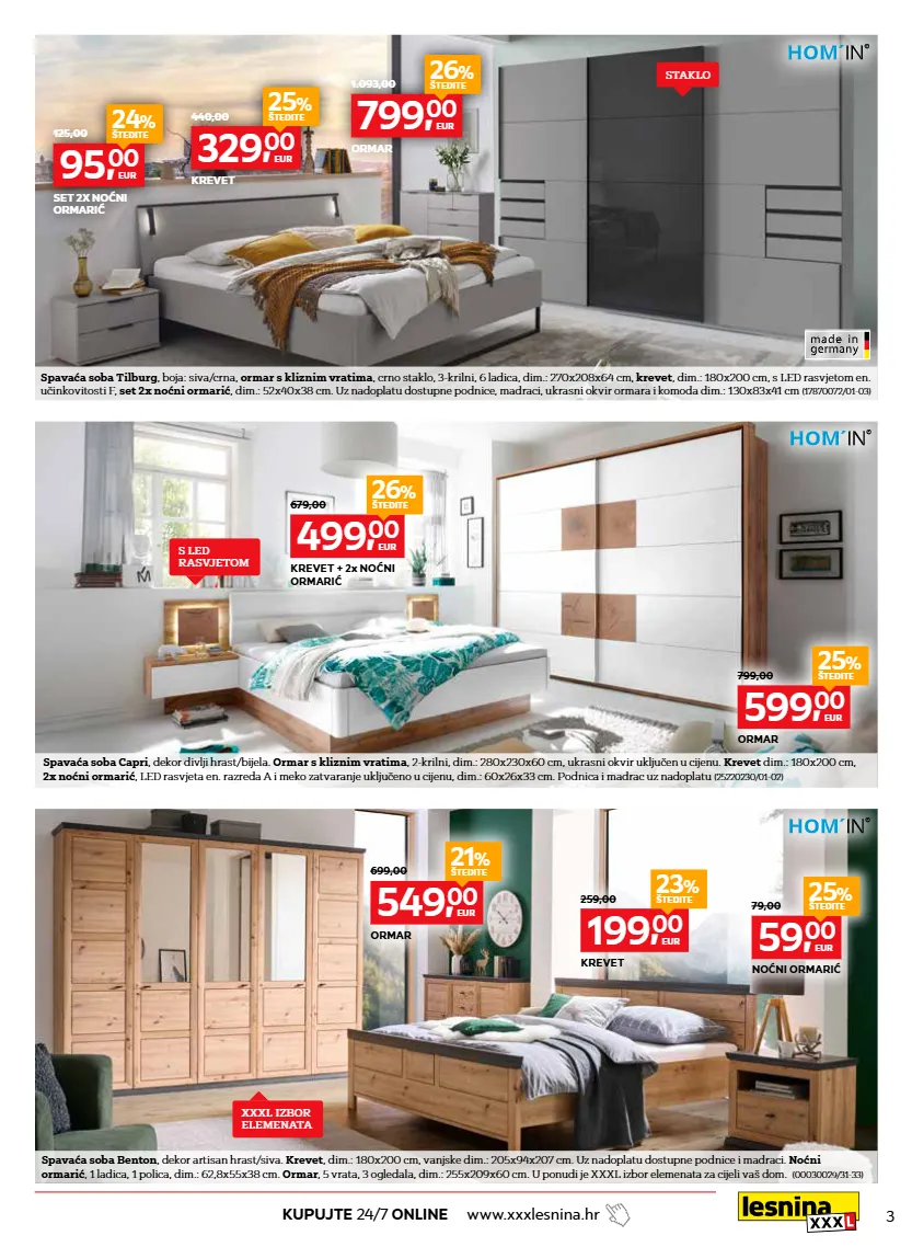 3 kupujte 24/7 online www.xxxlesnina.hr spavaća soba tilburg , boja: siva/crna, ormar s kliznim vratima , crno staklo, 3-krilni, 6 ladica, dim.: 270x208x64 cm, krevet , dim.: 180x200 cm, s led rasvjetom en. učinkovitosti f, set 2x noćni ormarić , dim.: 52x40x38 cm. uz nadoplatu dostupne podnice, madraci, ukrasni okvir ormara i komoda dim.: 130x83x41 cm (17870072/01-03) spavaća soba capri , dekor divlji hrast/bijela. ormar s kliznim vratima , 2-krilni, dim.: 280x230x60 cm, ukrasni okvir uključen u cijenu. krevet dim.: 180x200 cm, 2x noćni ormarić , led rasvjeta en. razreda a i meko zatvaranje uključeno u cijenu, dim.: 60x26x33 cm. podnica i madrac uz nadoplatu (25220230/01-02) spavaća soba benton , dekor artisan hrast/siva. krevet , dim.: 180x200 cm, vanjske dim.: 205x94x207 cm. uz nadoplatu dostupne podnice i madraci. noćni ormarić , 1 ladica, 1 polica, dim.: 62,8x55x38 cm. ormar , 5 vrata, 3 ogledala, dim.: 255x209x60 cm. u ponudi je xxxl izbor elemenata za cijeli vaš dom. (00030029/31-33) 199, 00 eur 23 % štedite 259,00 krevet 59, 00 eur 25 % štedite 79,00 noćni ormarić 549, 00 eur 21 % štedite 699,00 ormar 599, 00 eur 25 % štedite 799,00 ormar 499, 00 eur 26 % štedite 679,00 krevet + 2x noćni ormarić 799, 00 eur 26 % štedite 1.093,00 ormar 329, 00 eur 25 % štedite 440,00 krevet 95, 00 eur 24 % štedite 125,00 set 2x noćni ormarić xxxl izbor elemenata s led rasvjetom staklo