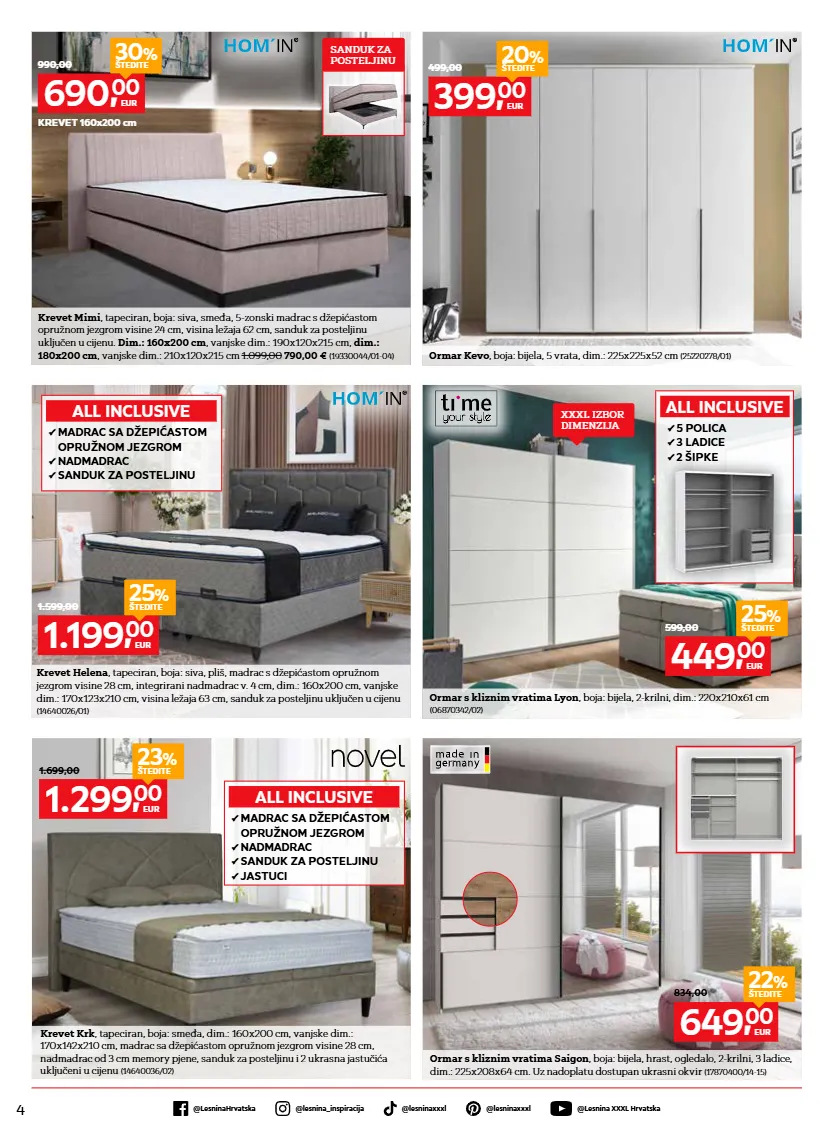 4 @lesnina xxxl hrvatska @lesninahrvatska @lesninaxxxl @lesninaxxxl @lesnina_inspiracija krevet mimi , tapeciran, boja: siva, smeđa, 5-zonski madrac s džepićastom opružnom jezgrom visine 24 cm, visina ležaja 62 cm, sanduk za posteljinu uključen u cijenu. dim.: 160x200 cm , vanjske dim.: 190x120x215 cm, dim.: 180x200 cm , vanjske dim.: 210x120x215 cm 1.099,00 790,00 € (19330044/01-04) krevet helena , tapeciran, boja: siva, pliš, madrac s džepićastom opružnom jezgrom visine 28 cm, integrirani nadmadrac v. 4 cm, dim.: 160x200 cm, vanjske dim.: 170x123x210 cm, visina ležaja 63 cm, sanduk za posteljinu uključen u cijenu (14640026/01) ormar s kliznim vratima lyon , boja: bijela, 2-krilni, dim.: 220x210x61 cm (06870342/02) ormar s kliznim vratima saigon , boja: bijela, hrast, ogledalo, 2-krilni, 3 ladice, dim.: 225x208x64 cm. uz nadoplatu dostupan ukrasni okvir (17870400/14-15) krevet krk , tapeciran, boja: smeđa, dim.: 160x200 cm, vanjske dim.: 170x142x210 cm, madrac sa džepićastom opružnom jezgrom visine 28 cm, nadmadrac od 3 cm memory pjene, sanduk za posteljinu i 2 ukrasna jastučića uključeni u cijenu (14640036/02) 1.299, 00 eur 23 % štedite 1.699,00 649, 00 eur 22 % štedite 834,00 449, 00 eur 25 % štedite 599,00 1.199, 00 eur 25 % štedite 1.599,00 399, 00 eur 20 % štedite 499,00 690, 00 eur 30 % štedite 990,00 krevet 160x200 cm ormar kevo , boja: bijela, 5 vrata, dim.: 225x225x52 cm (25220278/01) p 5 polica p 3 ladice p 2 šipke all inclusive p madrac sa džepićastom opružnom jezgrom p nadmadrac p sanduk za posteljinu p jastuci all inclusive p madrac sa džepićastom opružnom jezgrom p nadmadrac p sanduk za posteljinu all inclusive xxxl izbor dimenzija sanduk za posteljinu