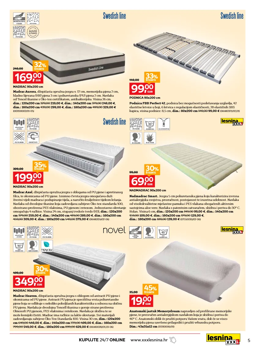 5 kupujte 24/7 online www.xxxlesnina.hr madrac aurora , džepićasta opružna jezgra v. 17 cm, memorijska pjena 2 cm, hladno lijevana (hr) pjena 3 cm i poliuretanska (pu) pjena 2 cm. navlaka od tencel tkanine s öko-tex certifikatom, antibakterijska. visina 26 cm, dim.: 120x200 cm 329,00 219,00 € , dim.: 140x200 cm 379,00 249,00 € , dim.: 160x200 cm 439,00 299,00 € , dim.: 180x200 cm 499,00 329,00 € (002d0002/01-05) madrac axel , džepićasta opružna jezgra s oblogama od pu pjene i apretiranog filca, te okomicama od pu pjene. iznimno čvrsta jezgra omogućava duži životni vijek madraca i podupiranje tijela, a naročito kralježnice tijekom ležanja. navlaka od dvoslojne tkanine koja zadovoljava zahtjeve öko-tex standarda 100, obostrano prošivena pes vlaknima, pu pjenom i retexom. jednostavno okretanje omogučuju 4 ručkice. visina 24 cm, stupanj trvdoće tvrdo (h3), dim.: 120x200 cm 379,00 259,00 € , dim.: 140x200 cm 419,00 289,00 € , dim.: 160x200 cm 459,00 309,00 € , dim.: 180x200 cm 549,00 379,00 € (06980119/02-06) madrac heaven , džepićasta opružna jezgra s oblogom od antracit pu pjene i okomicama od pu pjene. antracit pu pjena je specifična vrsta poliuretanske pjene koja se odlikuje s nekoliko poboljšanih karakteristika u odnosu na običnu pu pjenu. navlaka je dvoslojna tencell tkanina s gornje strane prošivena olmosoft pu pjenom, pes vlaknima i reteksom. navlaka je skidiva te se može kemijski čistiti. madrac ima ručkice za lakše okretanje. svi materijali zadovoljavaju zahtjeve öko-tex standarda 100. visina 30 cm, dim.: 120x200 cm 649,00 449,00 € , dim.: 140x200 cm 729,00 499,00 € , dim.: 160x200 cm 799,00 549,00 € , dim.: 180x200 cm 899,00 629,00 € (06980028/01,03-06) anatomski jastuk memorydream napravljen od profilirane memorijske pjene, te presvučen antialergijskom navlakom koja je skidiva i periva do 40° c. anatomski oblik će pružiti potporu vašem vratu, dok će se visco memorijska pjena savršeno prilagoditi i pružiti vrhunsku potporu. dim.: 43x31x12 cm (20310006/01) nadmadrac smart. jezgra 5 cm poliuretanska pjena koju karakterizira izvrsna antialergijska svojstva, prozračnost, postojanost te izuzetna udobnost. navlaka od visokokvalitetne mješavine pamuka i pes vlakana obogaćenih aktivnim sastojcima aloe vere. navlaka s patentnim zatvaračem, skidiva i periva do 30° c. rolan. visina 6 cm, dim.: 120x200 cm 149,00 99,00 € , dim.: 140x200 cm 159,00 109,00 € , dim.: 160x200 cm 179,00 129,00 € , dim.: 180x200 cm 189,00 139,00 € (07550030/02-06) podnica fbb perfect 42 , podnica bez mogućnosti podešavanja uzglavlja, 42 elastične letvice u boji, 6 letvica s regulacijom elastičnosti, 28 elastičnih sbs kapica, visina podnice: 8,5 cm, dim.: 80x200 cm 149,00 99,00 € (06980321/02,01) 19, 00 eur 45 % štedite 35,00 69, 00 eur 30 % štedite 99,00 nadmadrac 90x200 cm 99, 00 eur 33 % štedite 149,00 podnica 90x200 cm 199, 00 eur 35 % štedite 309,00 madrac 90x200 cm 349, 00 eur 30 % štedite 499,00 madrac 90x200 cm 169, 00 eur 32 % štedite 249,00 madrac 90x200 cm memorijska pjena hr pjena pu pjena pu pjena pu pjena pu pjena džepićasta jezgra džepićasta jezgra pes vlakna pes vlakna okretati perivo do 40 perivo do 40 anti bakterijski perivo do 30 sa zatvaračem anti alergijski anti alergijski aloe vera visco elastična pjena