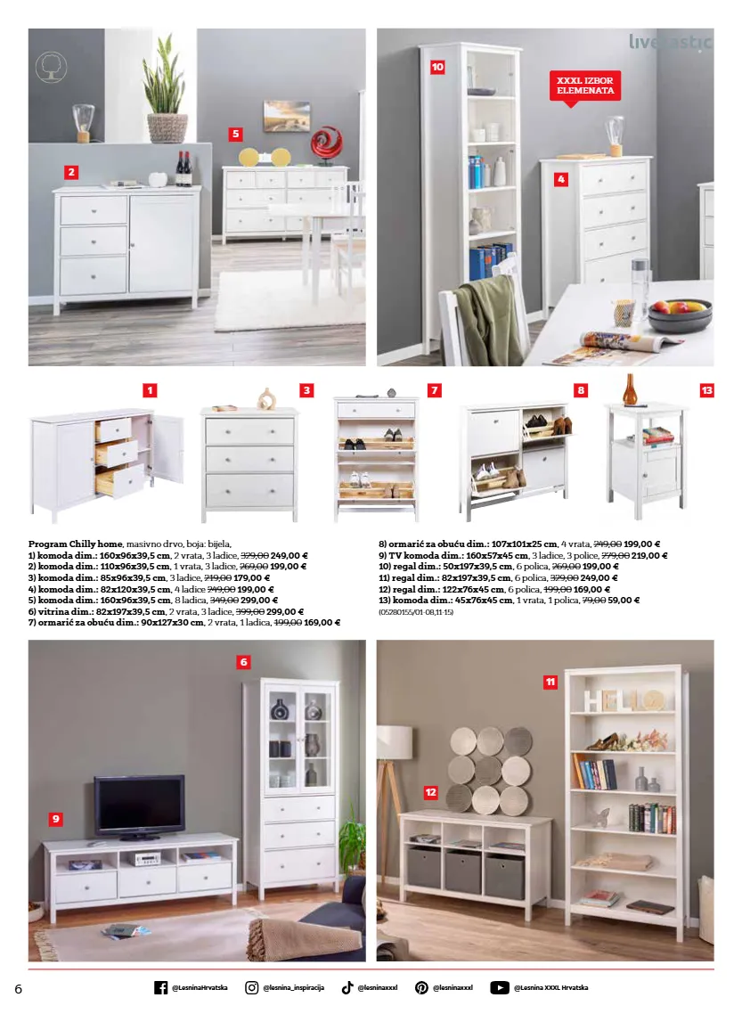 6 @lesnina xxxl hrvatska @lesninahrvatska @lesninaxxxl @lesninaxxxl @lesnina_inspiracija program chilly home , masivno drvo, boja: bijela, 1) komoda dim.: 160x96x39,5 cm , 2 vrata, 3 ladice, 329,00 249,00 € 2) komoda dim.: 110x96x39,5 cm , 1 vrata, 3 ladice, 269,00 199,00 € 3) komoda dim.: 85x96x39,5 cm , 3 ladice, 219,00 179,00 € 4) komoda dim.: 82x120x39,5 cm , 4 ladice 249,00 199,00 € 5) komoda dim.: 160x96x39,5 cm , 8 ladica, 349,00 299,00 € 6) vitrina dim.: 82x197x39,5 cm , 2 vrata, 3 ladice, 399,00 299,00 € 7) ormarić za obuću dim.: 90x127x30 cm , 2 vrata, 1 ladica, 199,00 169,00 € 8) ormarić za obuću dim.: 107x101x25 cm , 4 vrata, 249,00 199,00 € 9) tv komoda dim.: 160x57x45 cm , 3 ladice, 3 police, 279,00 219,00 € 10) regal dim.: 50x197x39,5 cm , 6 polica, 269,00 199,00 € 11) regal dim.: 82x197x39,5 cm , 6 polica, 329,00 249,00 € 12) regal dim.: 122x76x45 cm , 6 polica, 199,00 169,00 € 13) komoda dim.: 45x76x45 cm , 1 vrata, 1 polica, 79,00 59,00 € (05280155/01-08,11-15) 1 8 4 7 10 6 3 9 12 13 11 5 2 xxxl izbor elemenata