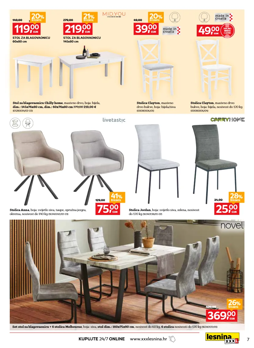 7 kupujte 24/7 online www.xxxlesnina.hr stolica clayton , masivno drvo bukve, boja: bijela/siva (00080006/01) stolica jordan , boja: svijetlo siva, zelena, nosivost do 120 kg (16340138/01-02) stolica anna , boja: svijetlo siva, taupe, opružna jezgra, okretna, nosivost do 140 kg (16340092/02-03) stol za blagovaonicu chilly home , masivno drvo, boja: bijela, dim.: 145x76x80 cm, dim.: 60x76x80 cm 279,00 219,00 € (05280014/02-03) massivholz 369, 00 eur 26 % štedite 499,00 75, 00 eur 41 % štedite 129,00 219, 00 eur 21 % štedite 279,00 stol za blagovaonicu 145x80 cm 119, 00 eur 20 % štedite 149,00 stol za blagovaonicu 60x80 cm 25, 00 eur 28 % štedite 34,90 set stol za blagovaonicu + 6 stolica melbourne , boja: siva, stol dim.: 160x75x90 cm , nosivost do 60 kg, 6 stolica nosivosti do 120 kg (16340122/01) stolica clayton , masivno drvo bukve, boja: bijela, nosivost do 120 kg (00080006/04) 49, 00 eur trajno cijena niska 39, 00 eur 20 % štedite 49,00