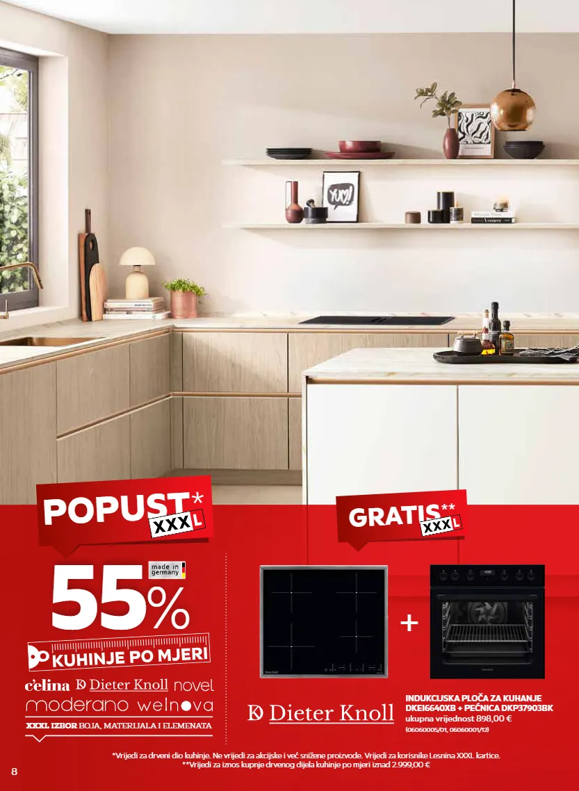 popust * gratis ** *vrijedi za drveni dio kuhinje. ne vrijedi za akcijske i već snižene proizvode. vrijedi za korisnike lesnina xxxl kartice. **vrijedi za iznos kupnje drvenog dijela kuhinje po mjeri iznad 2.999,00 € 55 % xxxl izbor boja, materijala i elemenata + indukcijska ploča za kuhanje dkei6640xb + pećnica dkp37903bk ukupna vrijednost 898,00 € (06060005/01, 06060001/12) 8